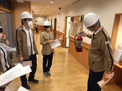 今回はお客様も参加しての避難訓練は行わず、通報訓練、消火器具の確認と設備の日常点検、屋外での模擬消火器を使っての消火訓練などを主体に行いました。