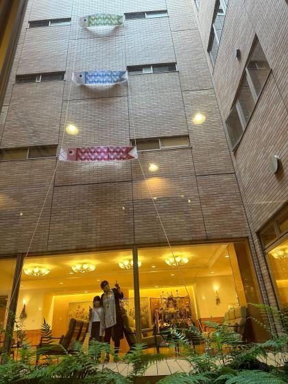 風が強く音がかなり共鳴してしまい、泣く泣くの数日限定ではあったのですが、各フロアのエレベーター前の窓から眺めることが出来、また各階からの見え方も違い、ひと味違った鯉のぼりとなりました。