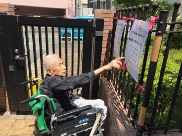 最後は口の運動と発語、事務所前での早口言葉に挑戦!