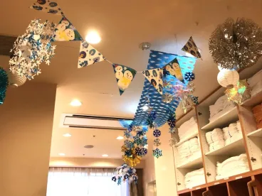 この冬は雪景色が臨めるかどうか…というところで、少しでも雪の雰囲気をお客様に楽しんでいただければと、職員で飾りつけをおこないました。