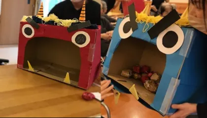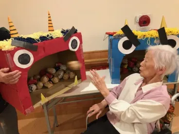 『鬼は~そと!福は~うち!!』の元気な掛け声と共に、豆に見立てた紙のボールを鬼の口めがけて投げ入れます。