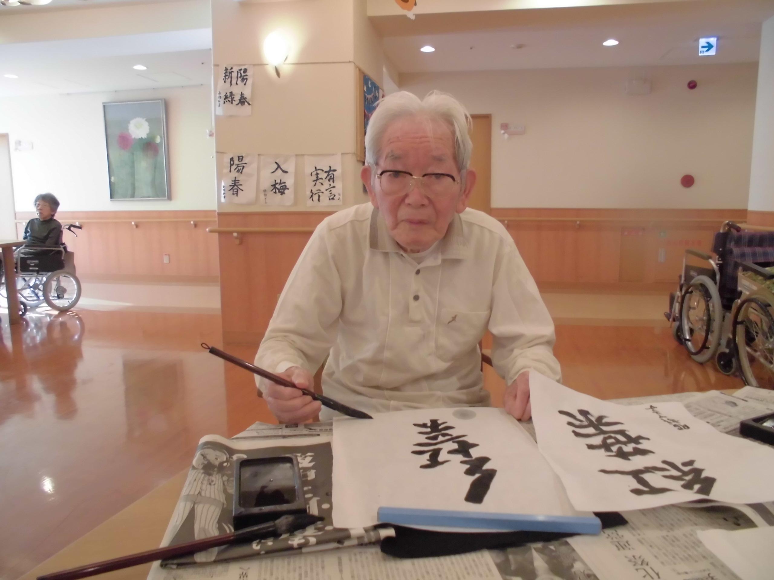 街の木々も紅葉が色づいてきています。秋といえば、「芸術の秋」ということで、今回は、書道を行いました。白紙に、たっぷりの墨をつけ、ひと文字、ひと文字丁寧に書を書かれていました。