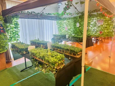 普段はテーブルとイスが並ぶだけの1階食堂が、緑豊かないちご園に様変わり。