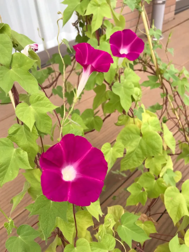 春にまいた朝顔の種、ぐんぐんとツルを伸ばしていましたが、なかなか花をつけず…。