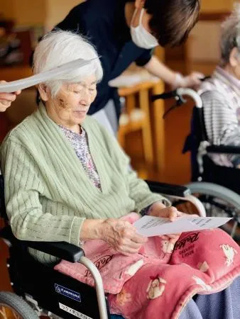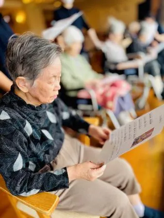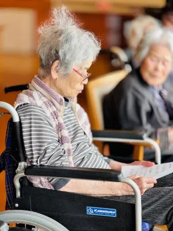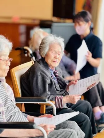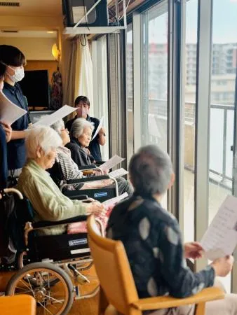 今月の歌は『りんごの歌』『夕焼け小焼け』など、秋を感じる曲が中心。スタッフのリードに合わせて皆さんの声がゆっくりと重なり、穏やかなハーモニーがフロアいっぱいに広がりました。外の空を眺めながら歌うと、まるで遠足に出かけたような気分です。