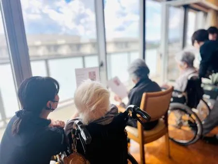 秋晴れの気持ちのよい日、食堂の窓際に車椅子や椅子を並べ、外の光を感じながら体操と歌の時間を行いました。大きな窓からはやわらかな日差しが差し込み、部屋の中はぽかぽか。