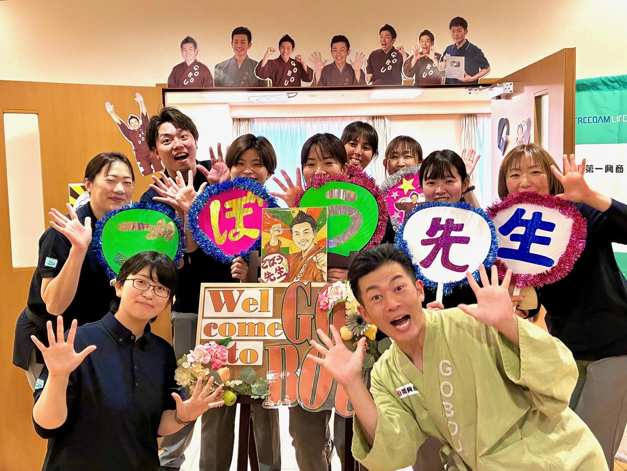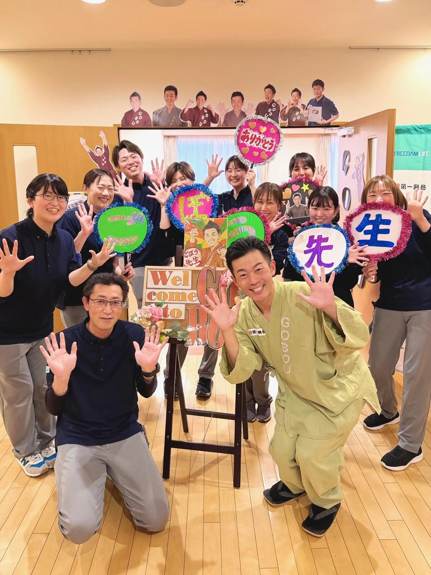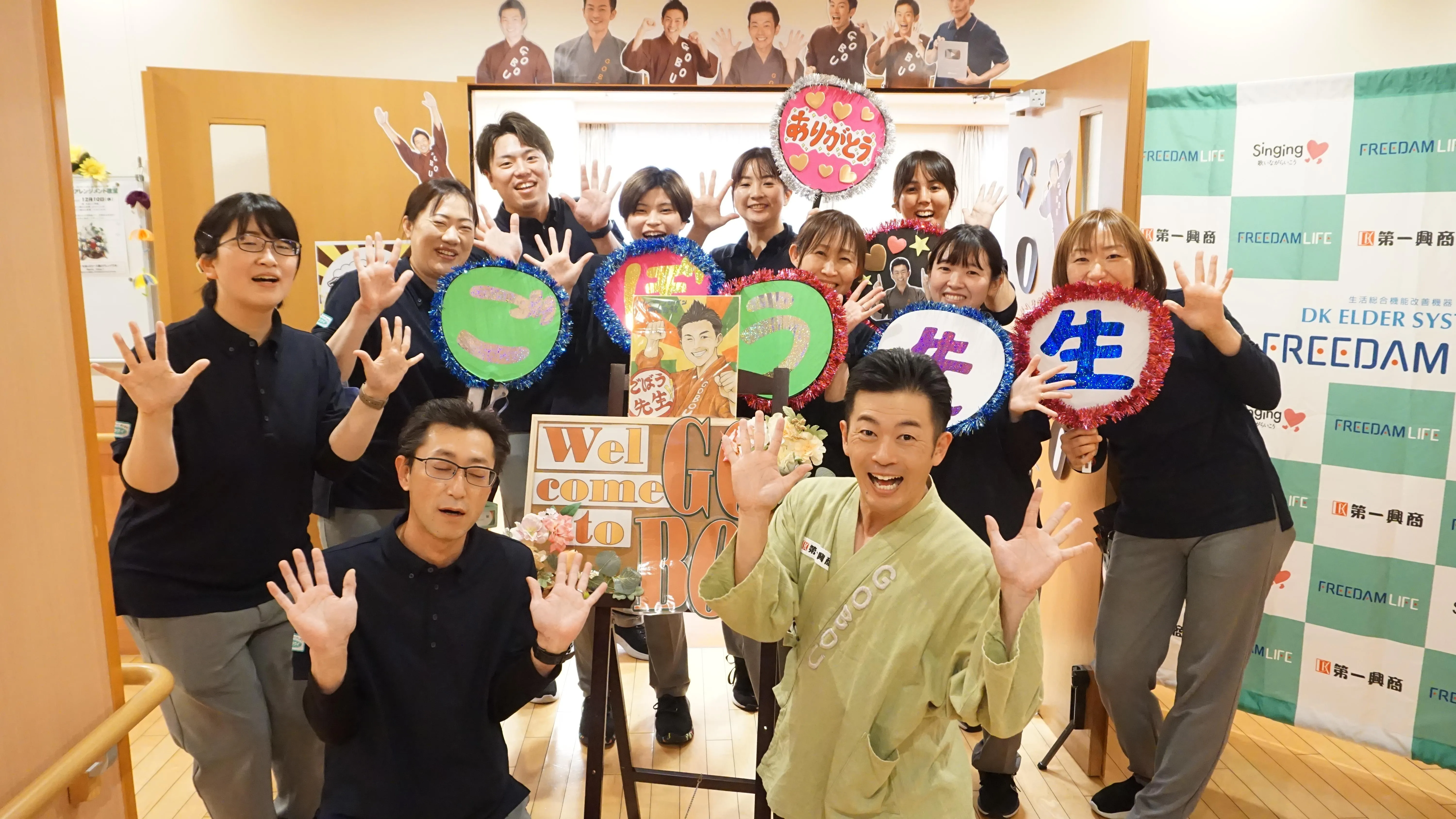 「ごぼう先生が営業所に来所し、レクリエーションで体操を実施してくださいます。是非うちに来てほしい!という事業所がありましたら、ご応募ください!」