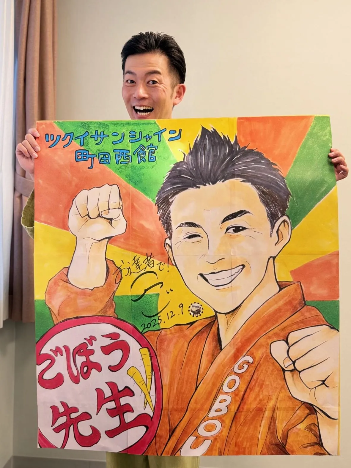 ・ 絵が得意なスタッフに、色紙にごぼう先生のイラストを依頼!