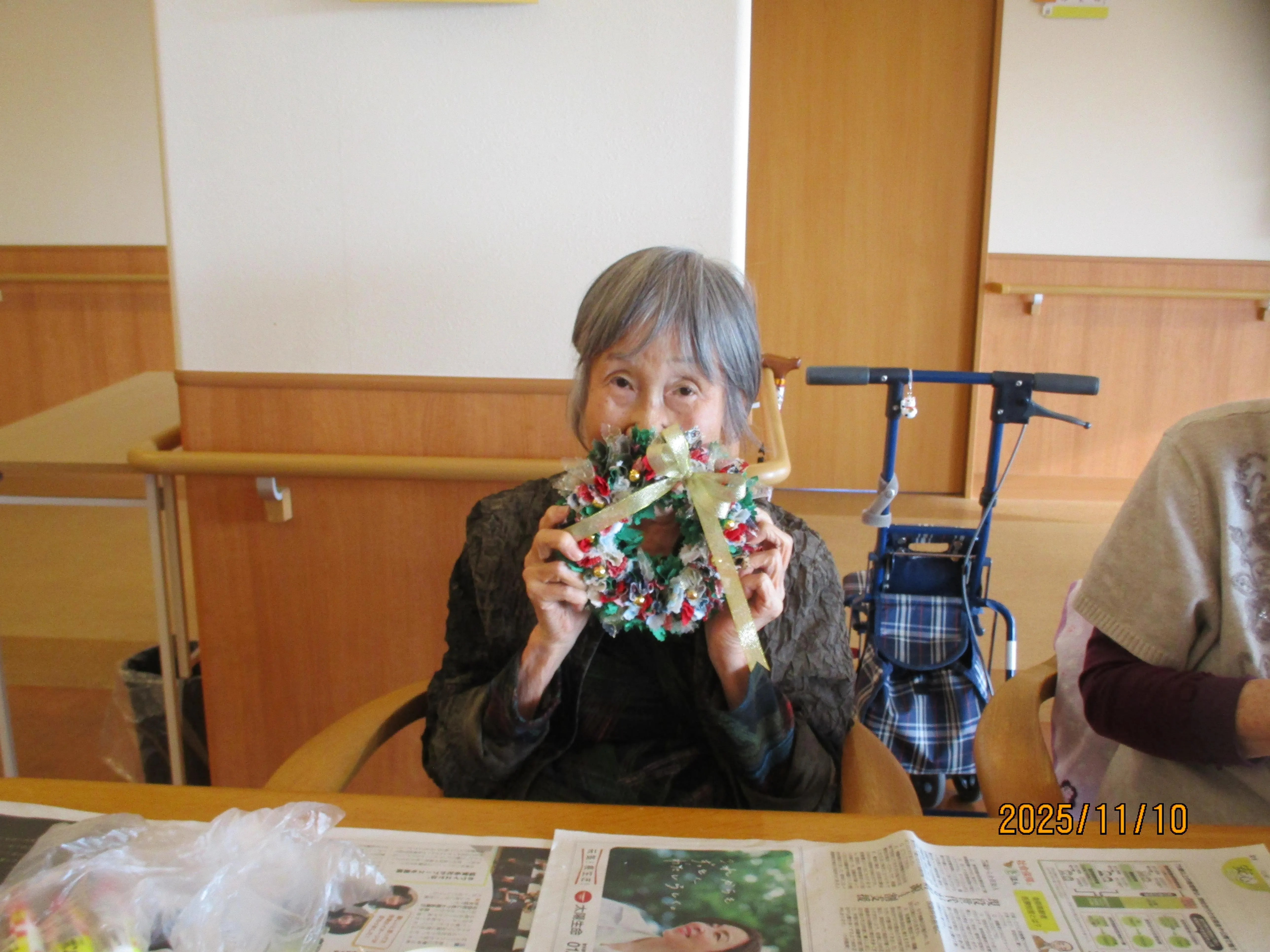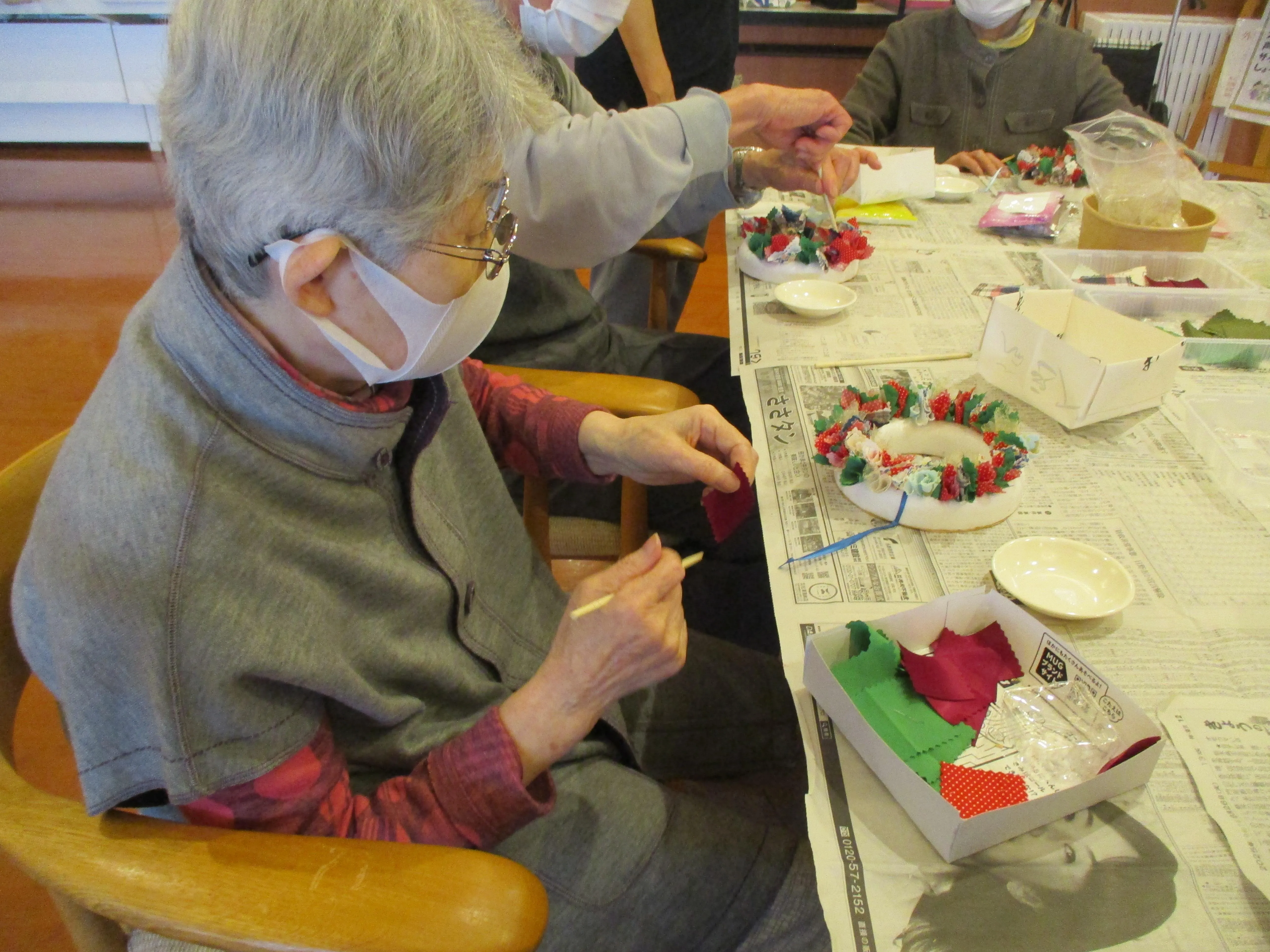 クリスマス会に向けて、皆様と一緒に手作りのクリスマスリース作りを行いました。