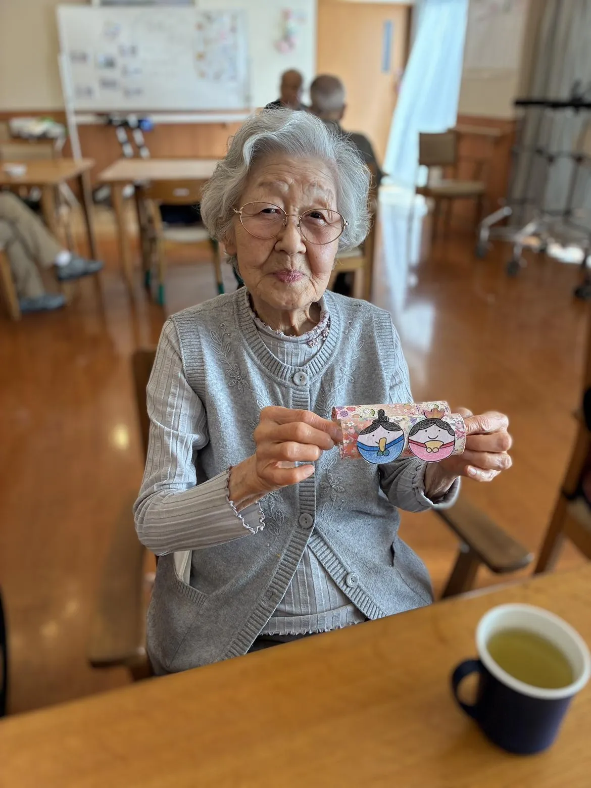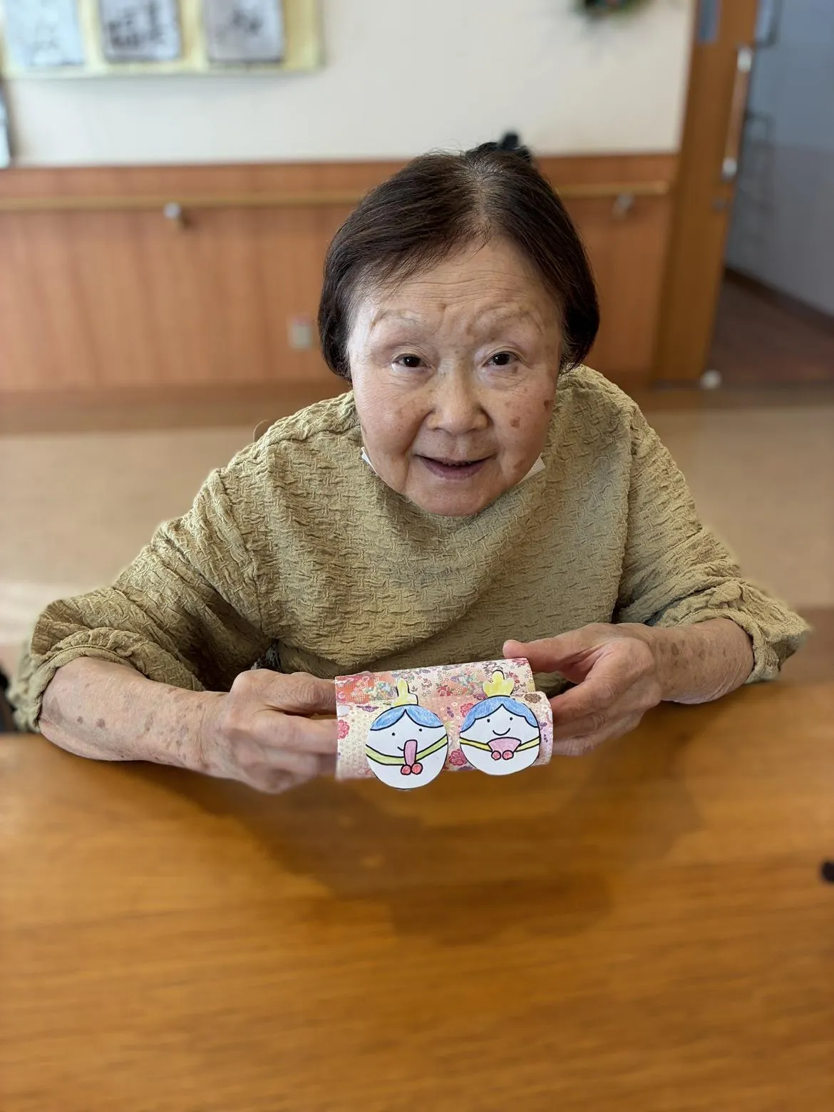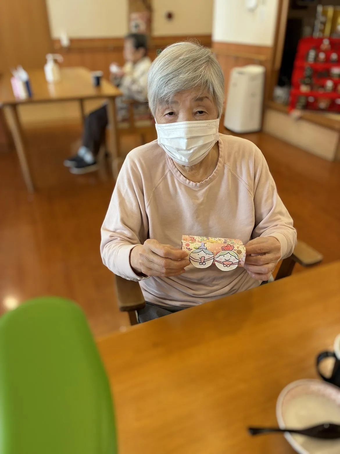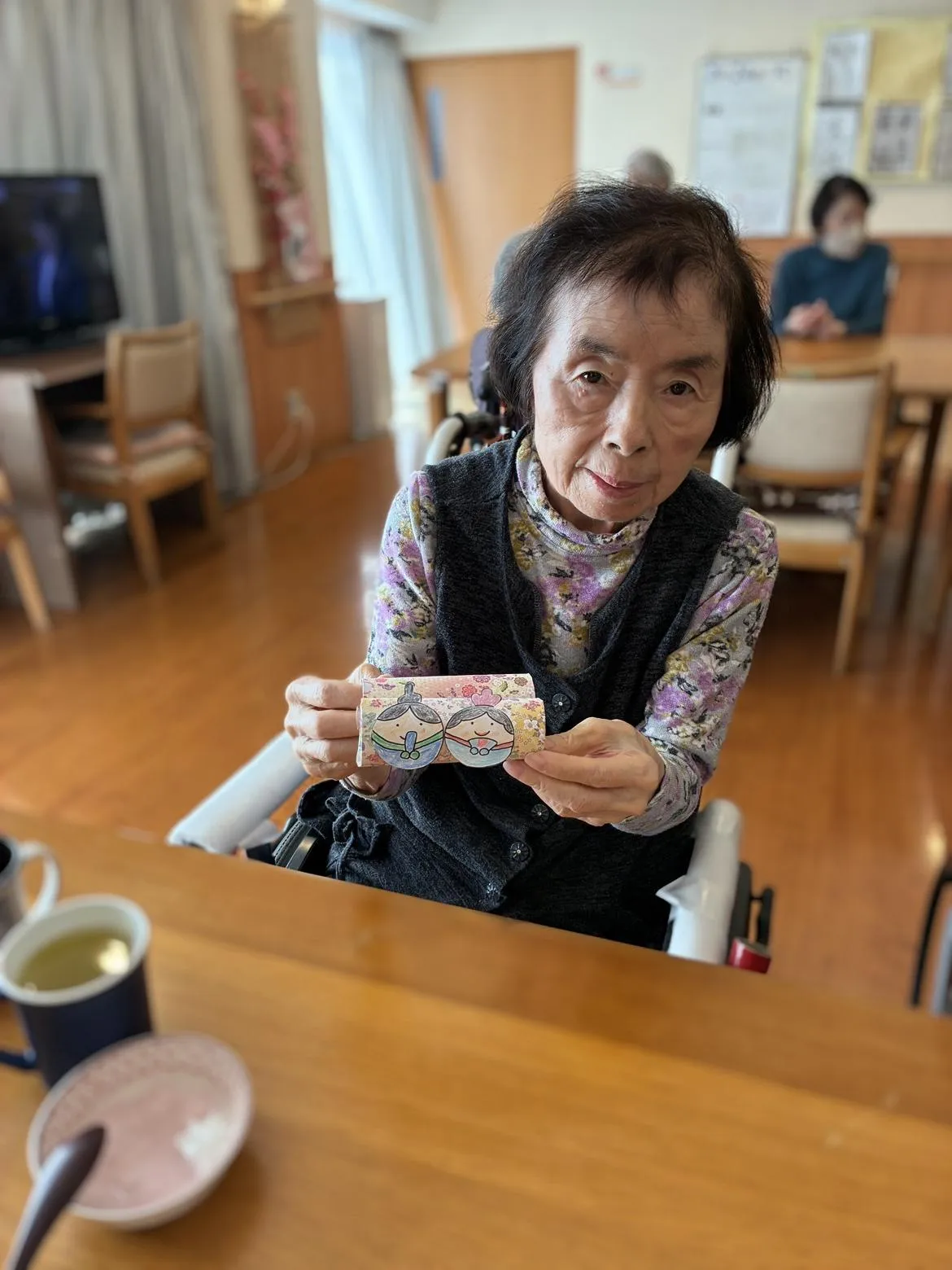 3月3日はひな祭り!ということで、毎月恒例の創作レクリエーションでは、お内裏様とお雛様の「特製・写真立て」を皆様と一緒に作成しました。