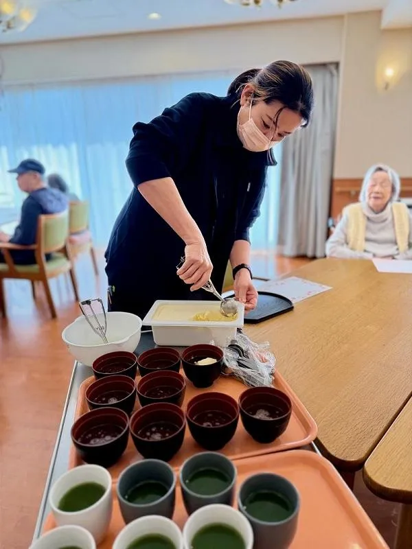 おやつレクリエーションにて、お客様よりいただいたリクエストにお応えし、ぜんざいにアイスをトッピングした特別なおやつを楽しんでいただきました。