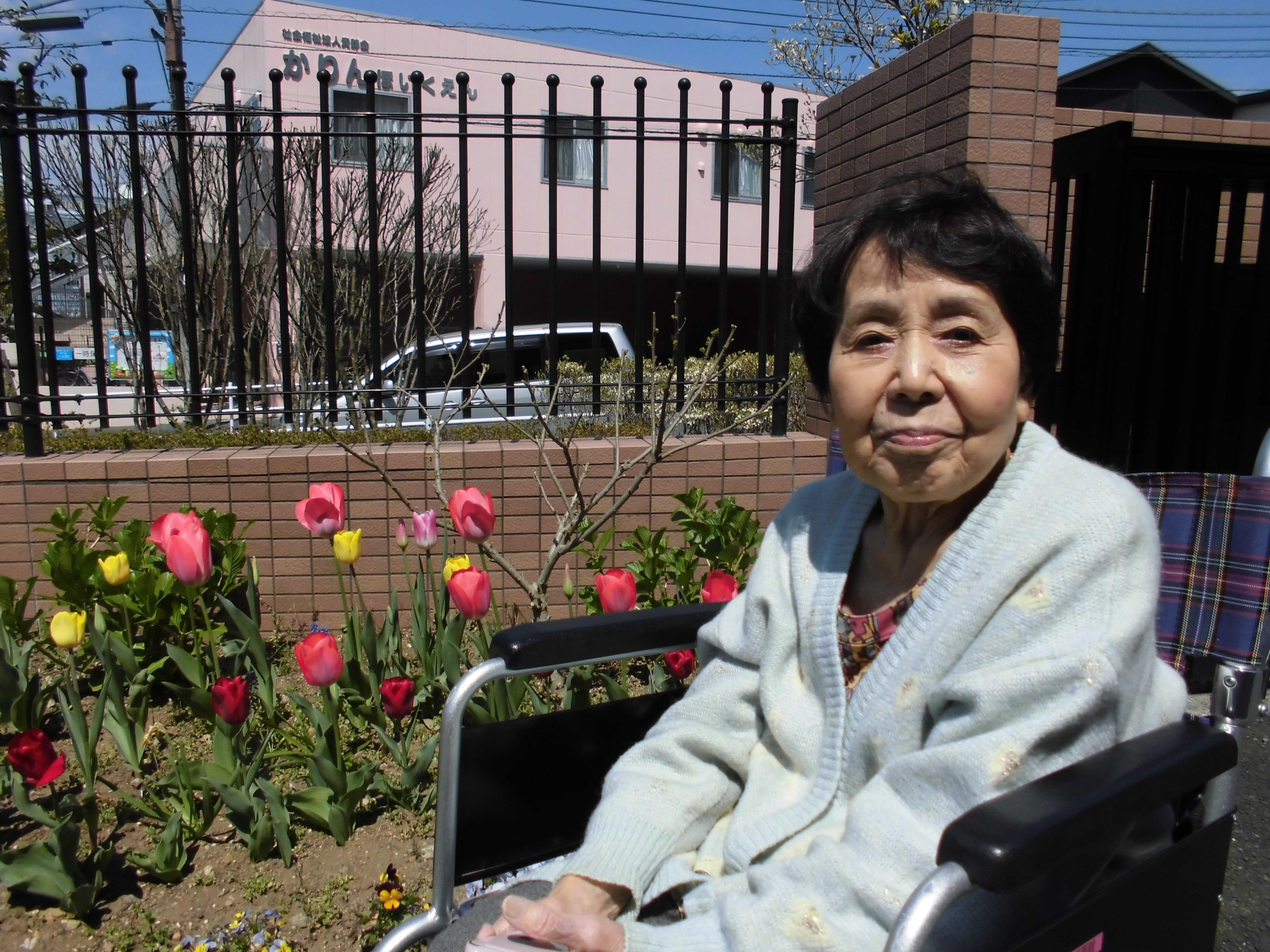 大分春らしい天気になりました。ツクイ・サンシャイン町田西館の庭には、チューリップの花が咲いております。散歩された際に、チューリップと一緒に写真をパチリと撮りました。皆さん素敵な笑顔で、写真におさまりました。