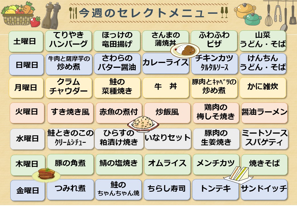曜日ごとにメニューは決められており、5週おきに変更となります。毎回違うメニューを選べば、全てのメニューを召し上がることも出来ます!