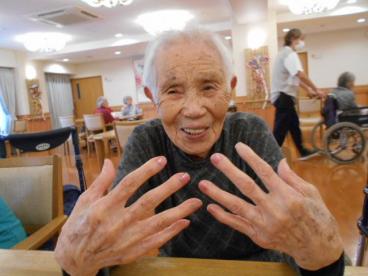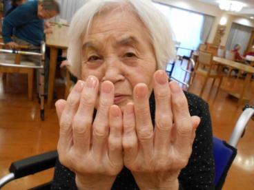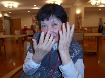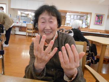 出来上がった、キラキラした爪を見て、「ほら見て、きれいでしょ?」「うれしいわ」とお話ししてくださいました。