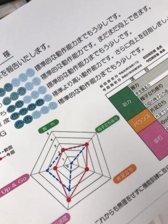 まずは基本的な質問を行い、握力、歩行、立ち座り、片足バランスなどなど、測定結果をフィールドバックレポートとして分かりやすい形で、ご家族にご報告させて頂いています。
