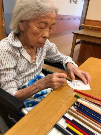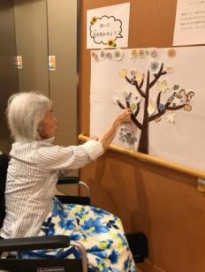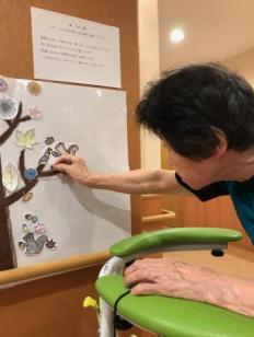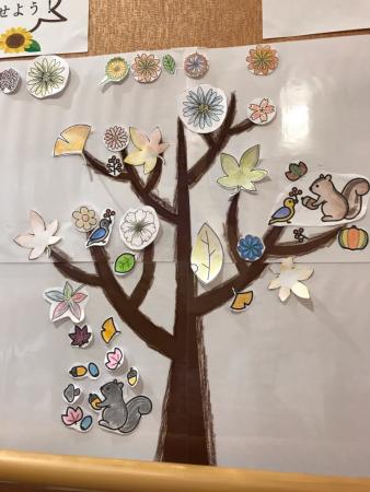 スタッフルームに置いてある、あるいはお客様にお渡しした季節の花や、木の実や葉などの切り抜きを食堂や居室に移動する際に貼って頂き、飾りを完成させましょうという企画です。