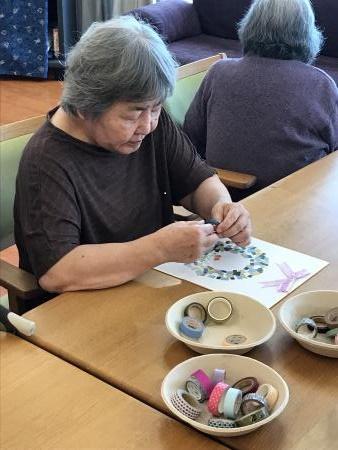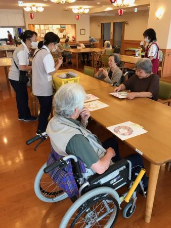 少し前のご報告になりますが、手芸クラブのご様子を掲載いたします。各階のレクリエーションとは別に、有志の職員が一緒に行っています。皆様の邪魔にならないよう(?)、こっそりとお邪魔させて頂きました。細かい作業もあり皆さま真剣。その集中力にびっくり。私はそそくさと退散させて頂きました…