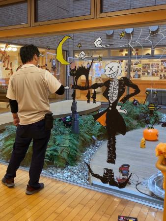 制作中から、廊下を歩くお客様や職員に声をかけられつつ、一発書きで事務所前の窓を飾ってくれました。
