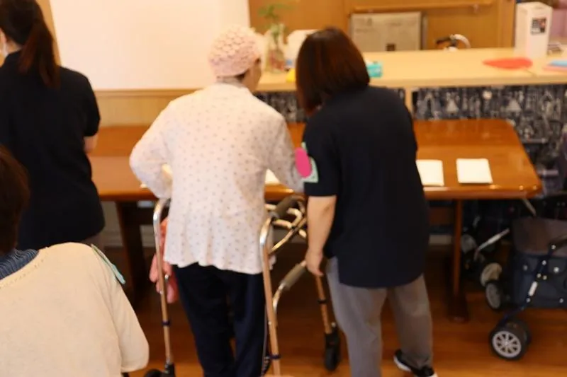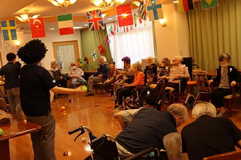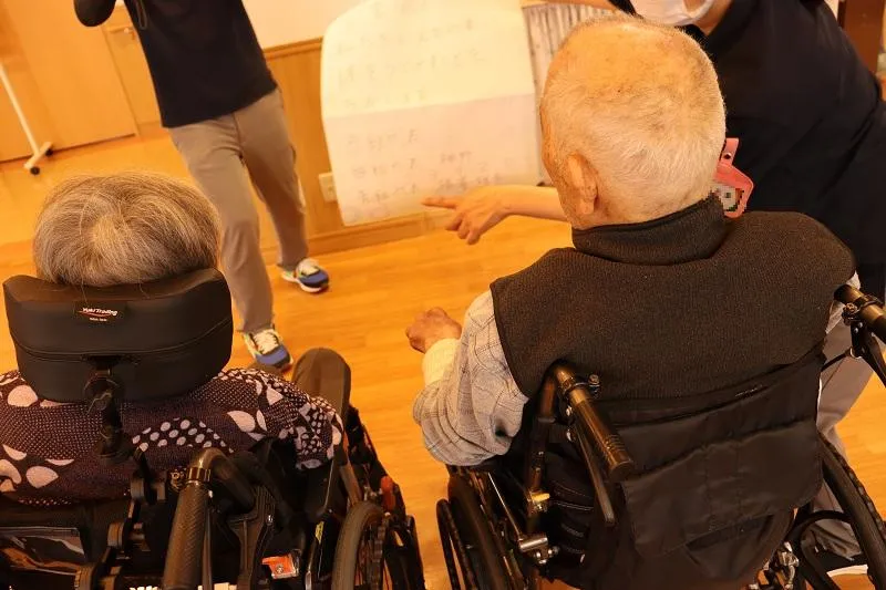 今日は、各階で運動会!最初に選手宣誓行い、安全に楽しく、3組に分かれて競い合いました。玉入れや借り物競争など行い、応援に熱が入りました。特に玉入れは、「多く入れるぞ!」と皆様笑顔で投げ白熱しており、安全面注意しながら、スタッフも汗を流しながら楽しみました。