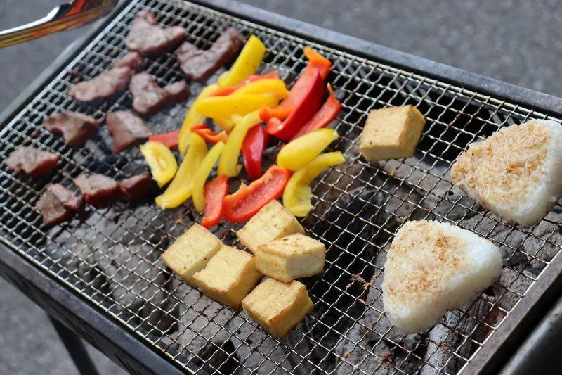 寒くはなく風もなく、本日はバーベキュー日和。選りすぐった黒毛和牛のお肉、新鮮な野菜をメインにして、スタッフが炭火で焼き上げました。炊き込みご飯や焼きおにぎり、締めは焼きそば・デザートにマンゴープリンなど。