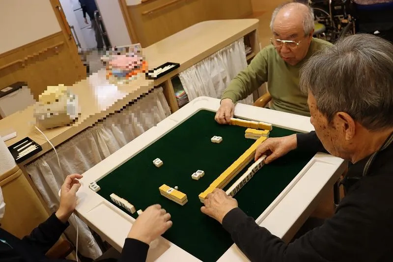2Fには麻雀台があります。定期的に麻雀を行っています。今日は、お客様2名とスタッフで麻雀を行いました!いい牌はくるか!?ドキドキしながら、楽しまれていました。
