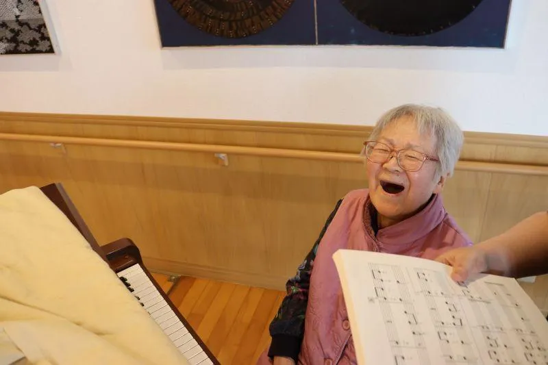 「もう分からんで」と言いつつ、久しぶりのピアノ演奏。楽しそうにピアノを演奏される様子が、伝わってくる笑顔だと思います。彼女はブランクありの「歌って弾けるシニア」です。