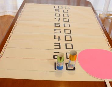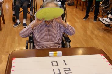 大きなうちわを仰ぎ、点数対決!目指せ100点!!