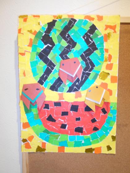 夏の思い出として、前回おりがみで作成した「セミ」を、貼り絵の「すいか」に貼って、壁画を作りました。
