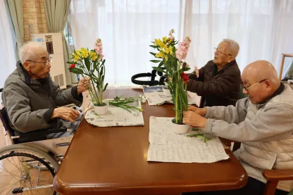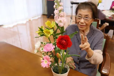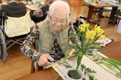 ハサミで切る、花を吸水フォームに挿す、といった一つの作品を作り上げるまでの一連の動作が、機能訓練になります!