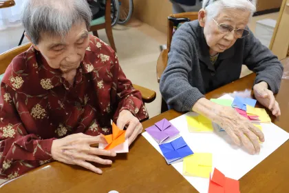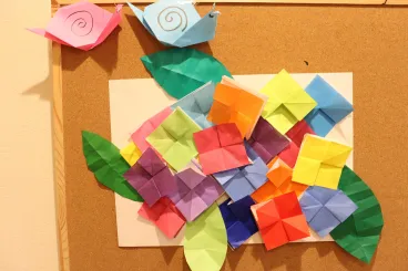 6月の作品作り、折り紙で折った紫陽花を画用紙に貼っていきます。