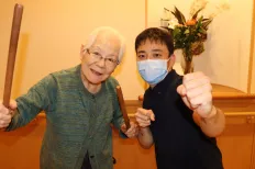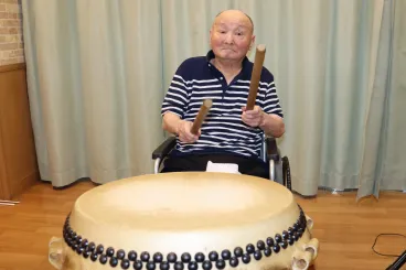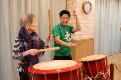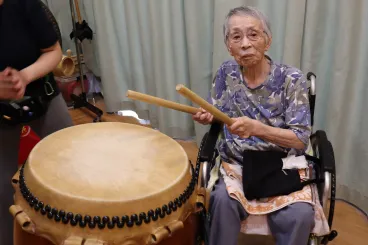 力強く太鼓を叩くうちに笑顔が広がり「楽しい」と大盛況でした!