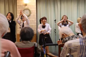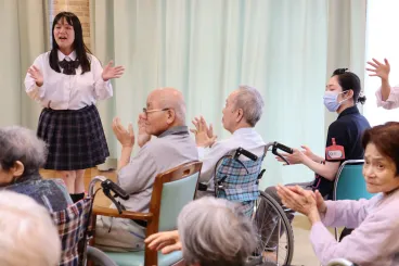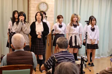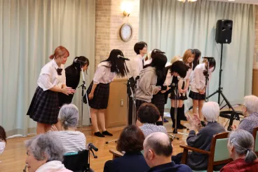 美空ひばりさんの歌や生きていることへの感謝の歌など、とてもメッセージ性の強い、しかし温かさを感じる歌声で、お客様と触れ合い会話する中で目に涙を浮かべる学生さんもいて見ているこちらの目頭が熱くなりました。