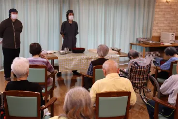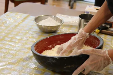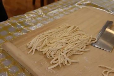 元うどん打ちの厨房スタッフと、香川出身の方と一緒に手打ちうどんの実演をしていただきました。