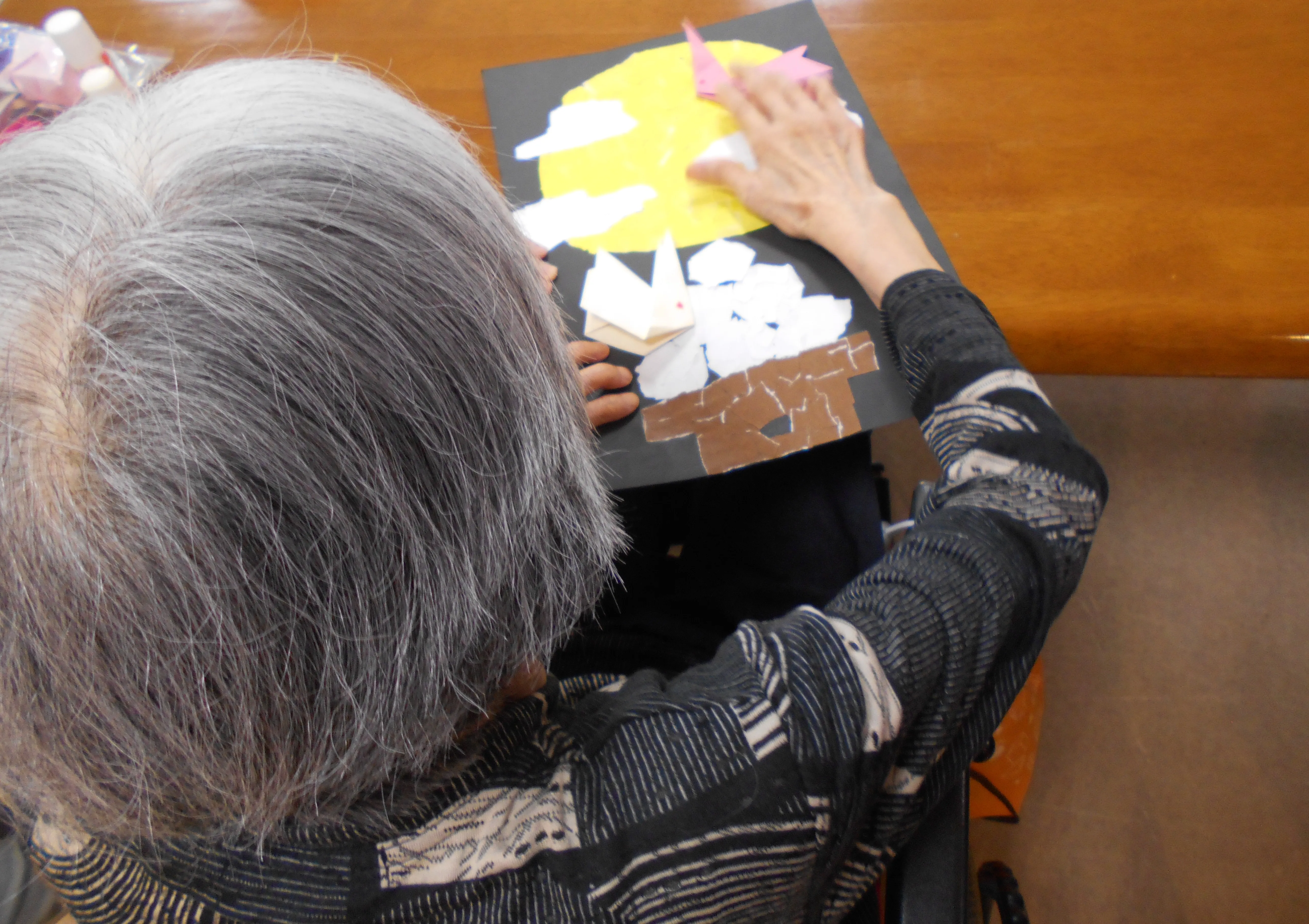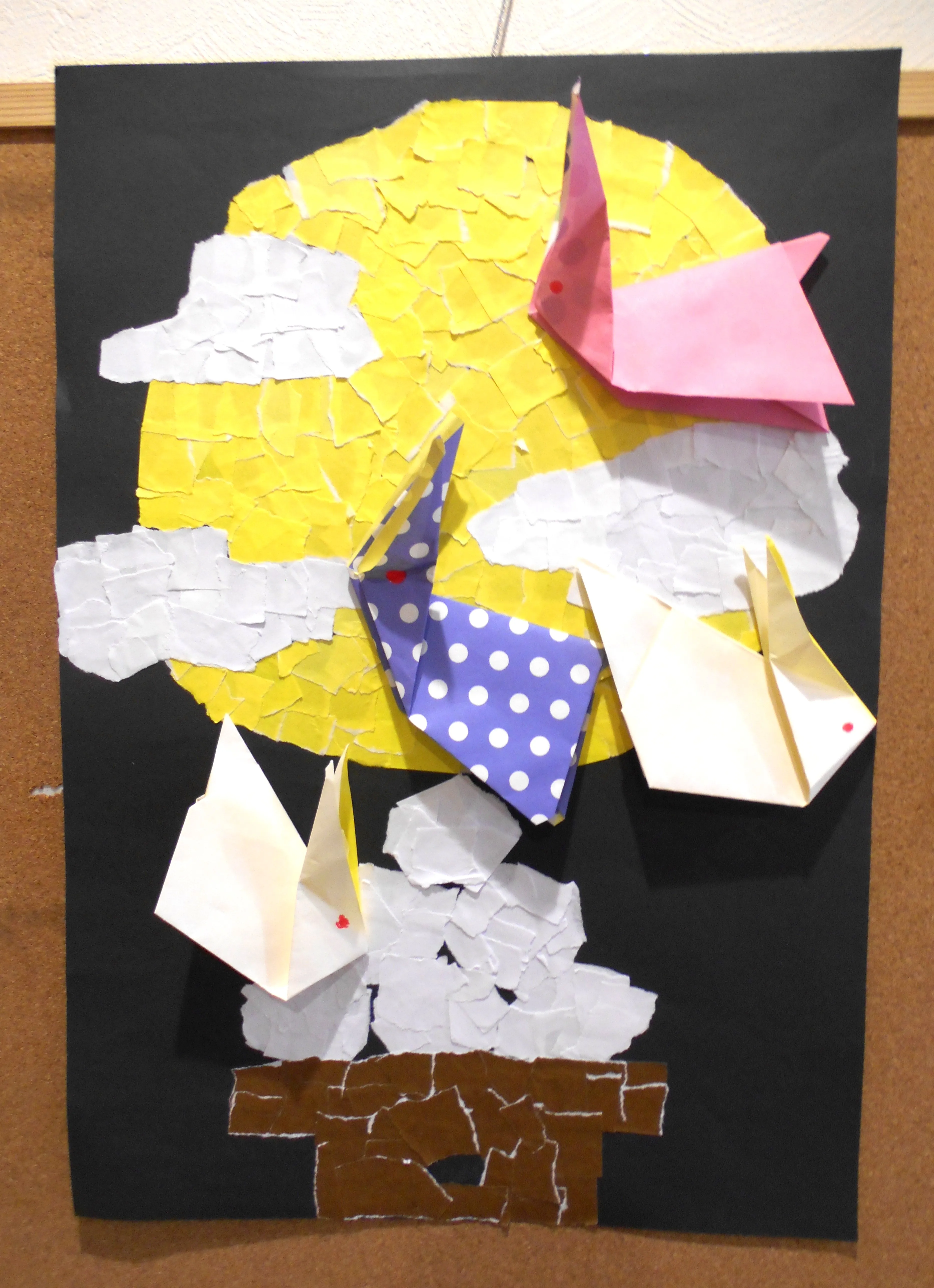 今日は、折ったウサギをお月見に見立てた貼り絵の上に飾ってもらいました