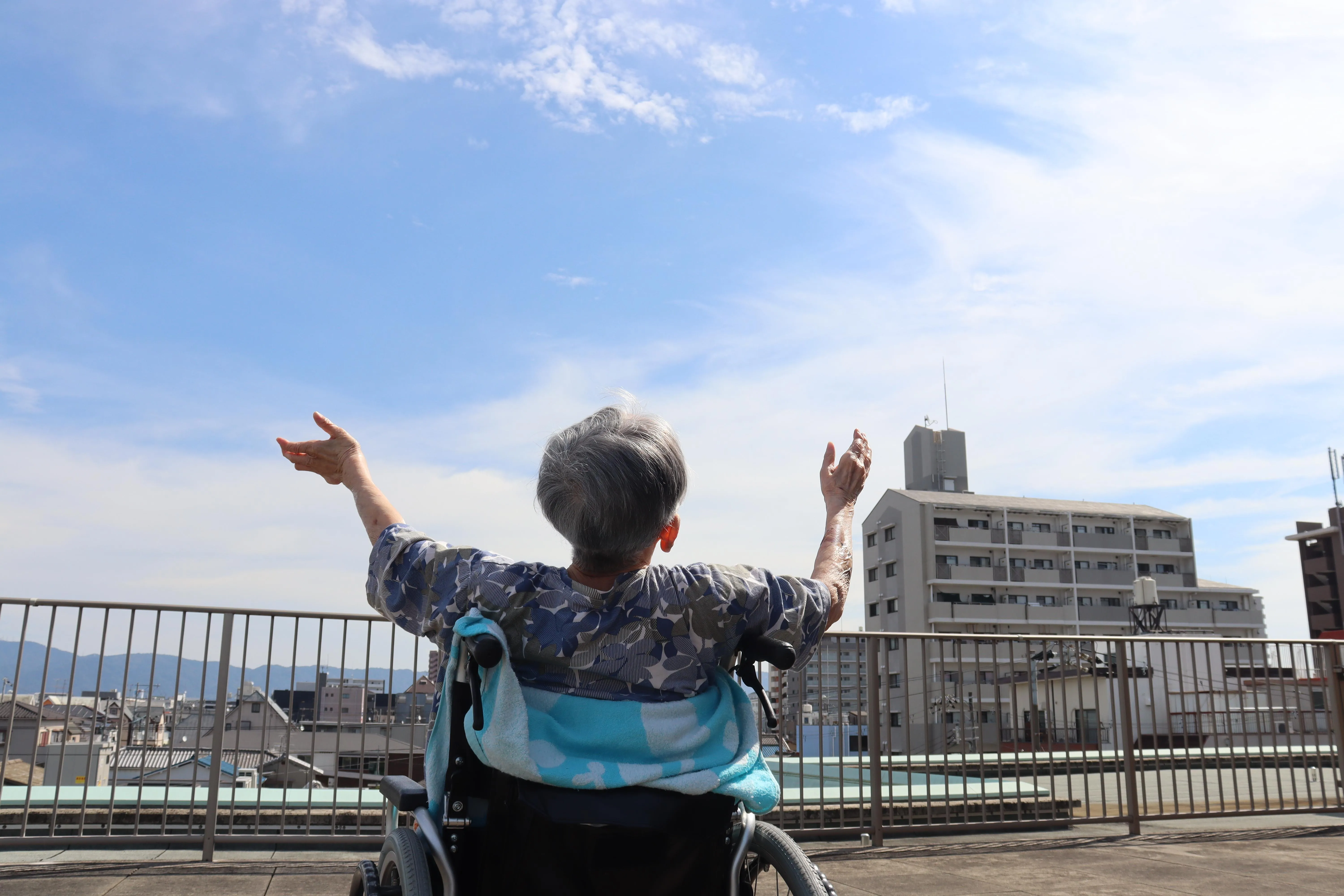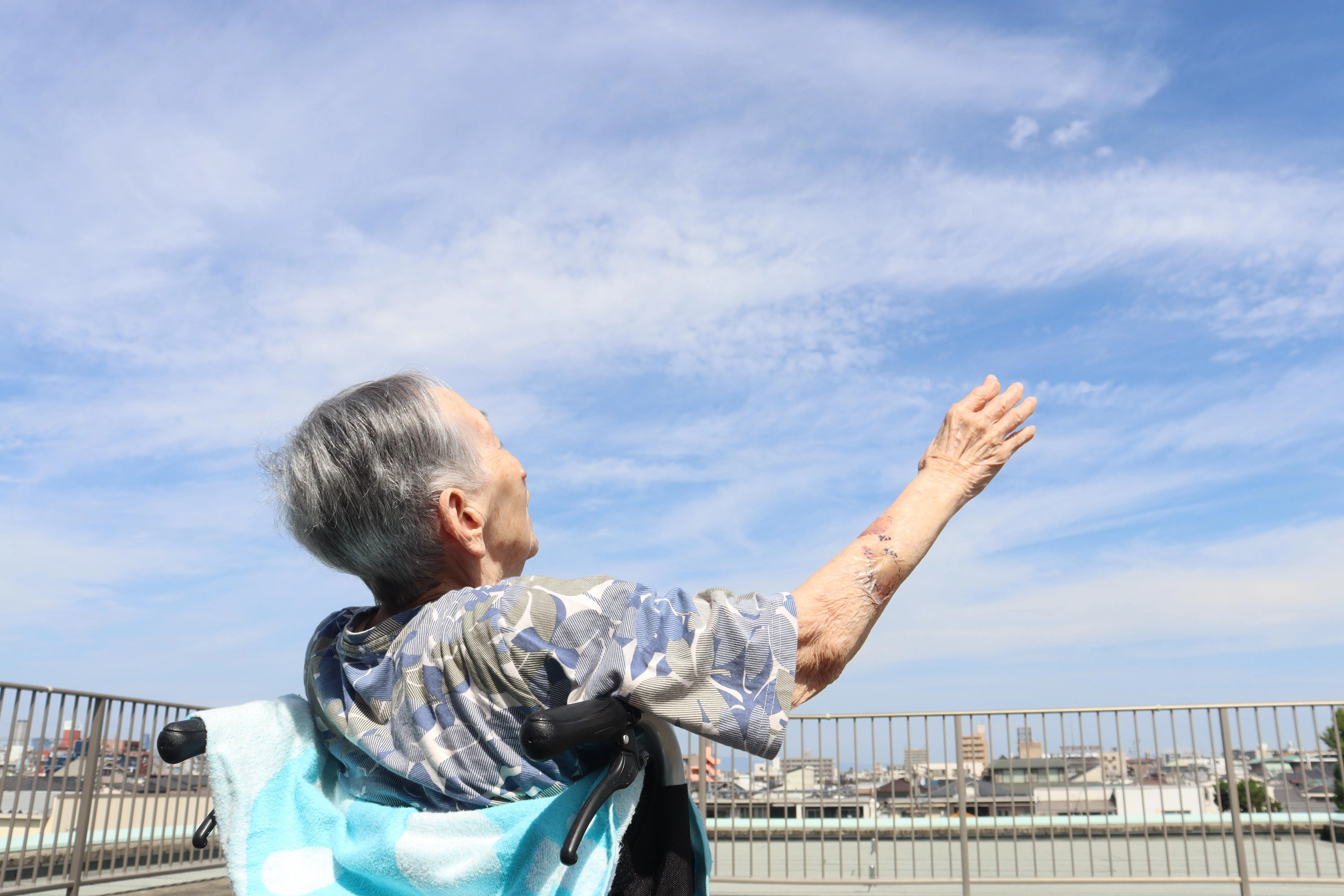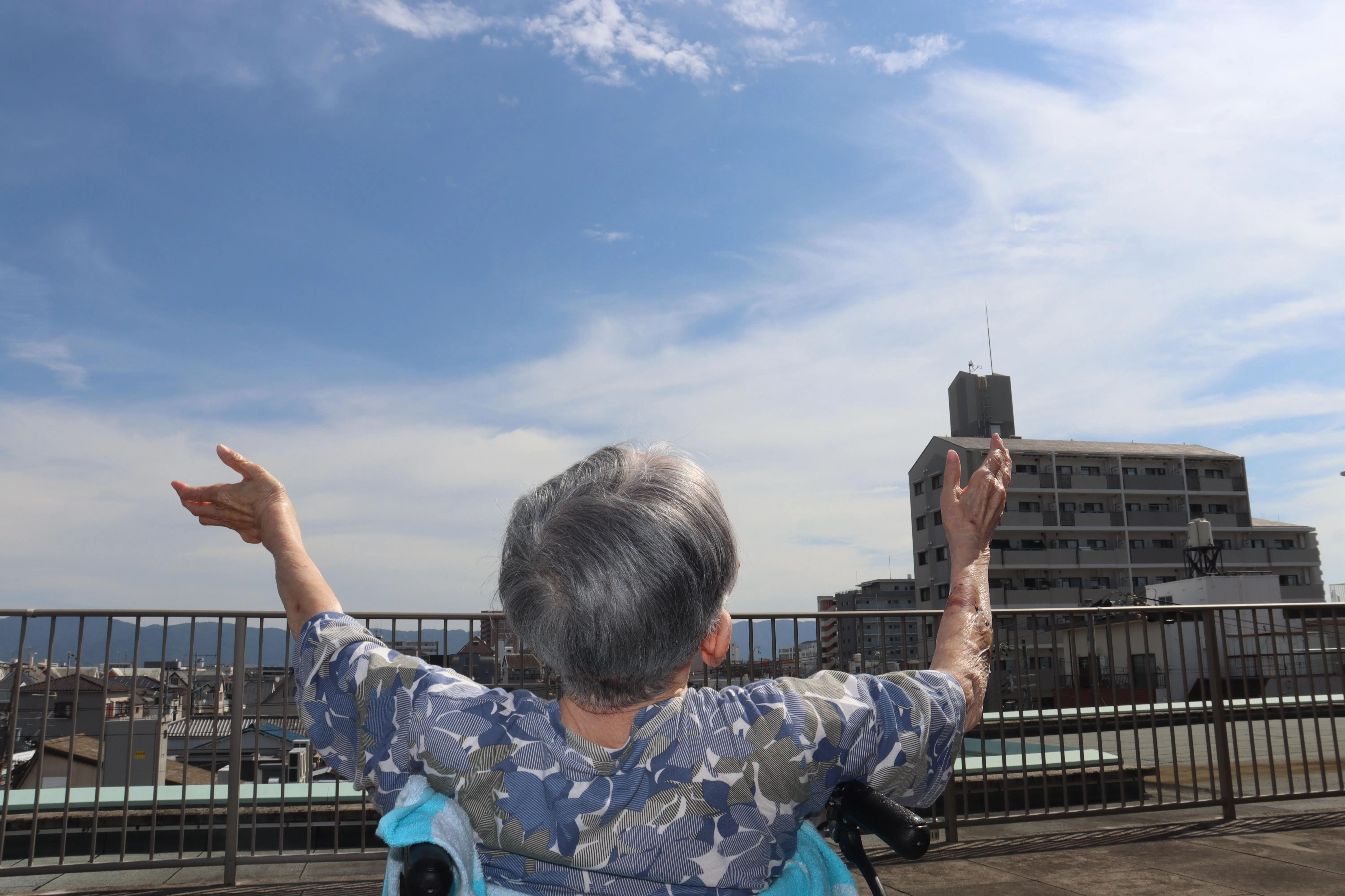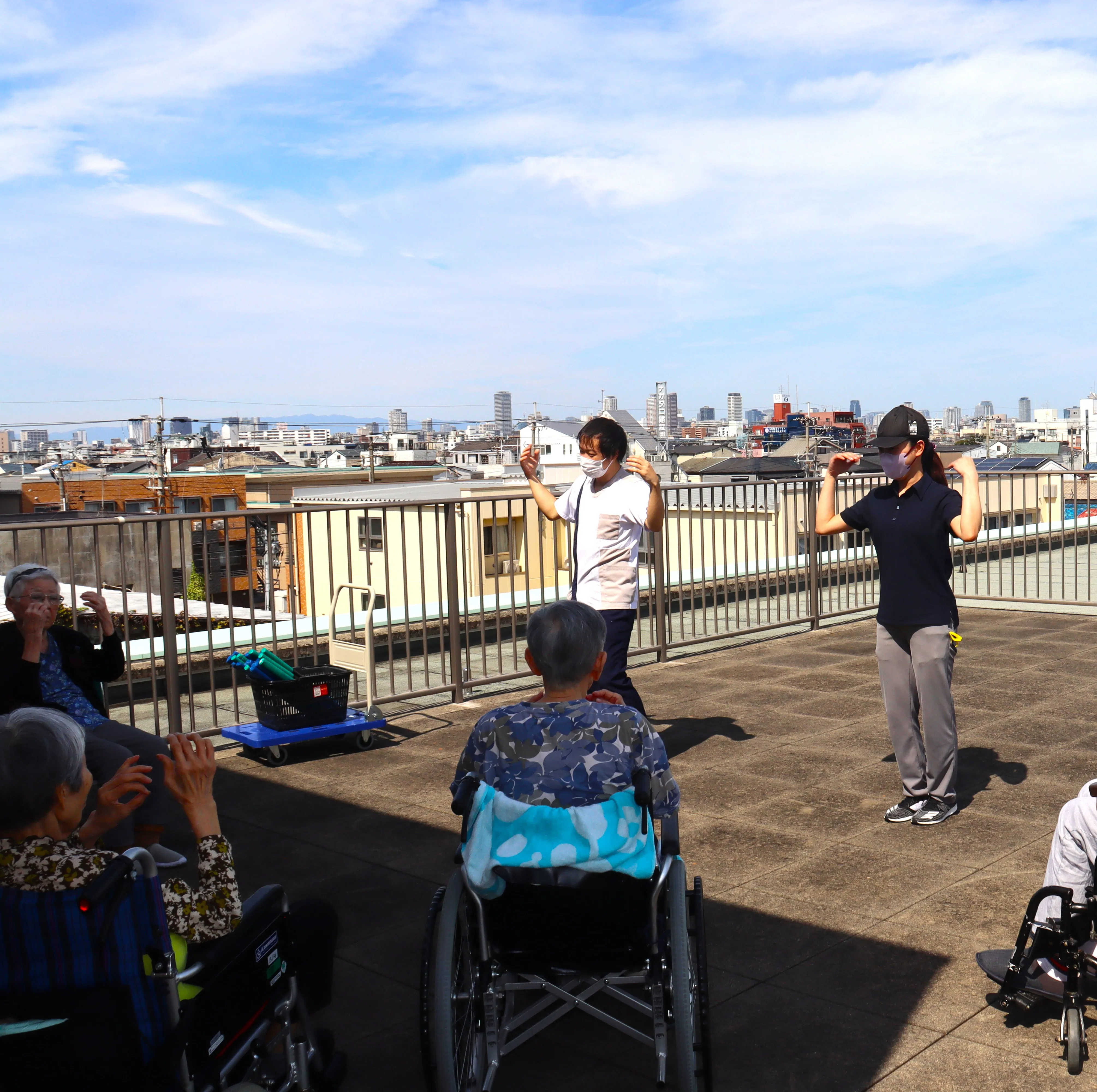 青空の下で体操をしました。空気が澄んで、暖かな日差しが心地よく感じられます。適度な太陽の光を浴びると、骨が強くなるといわれております。