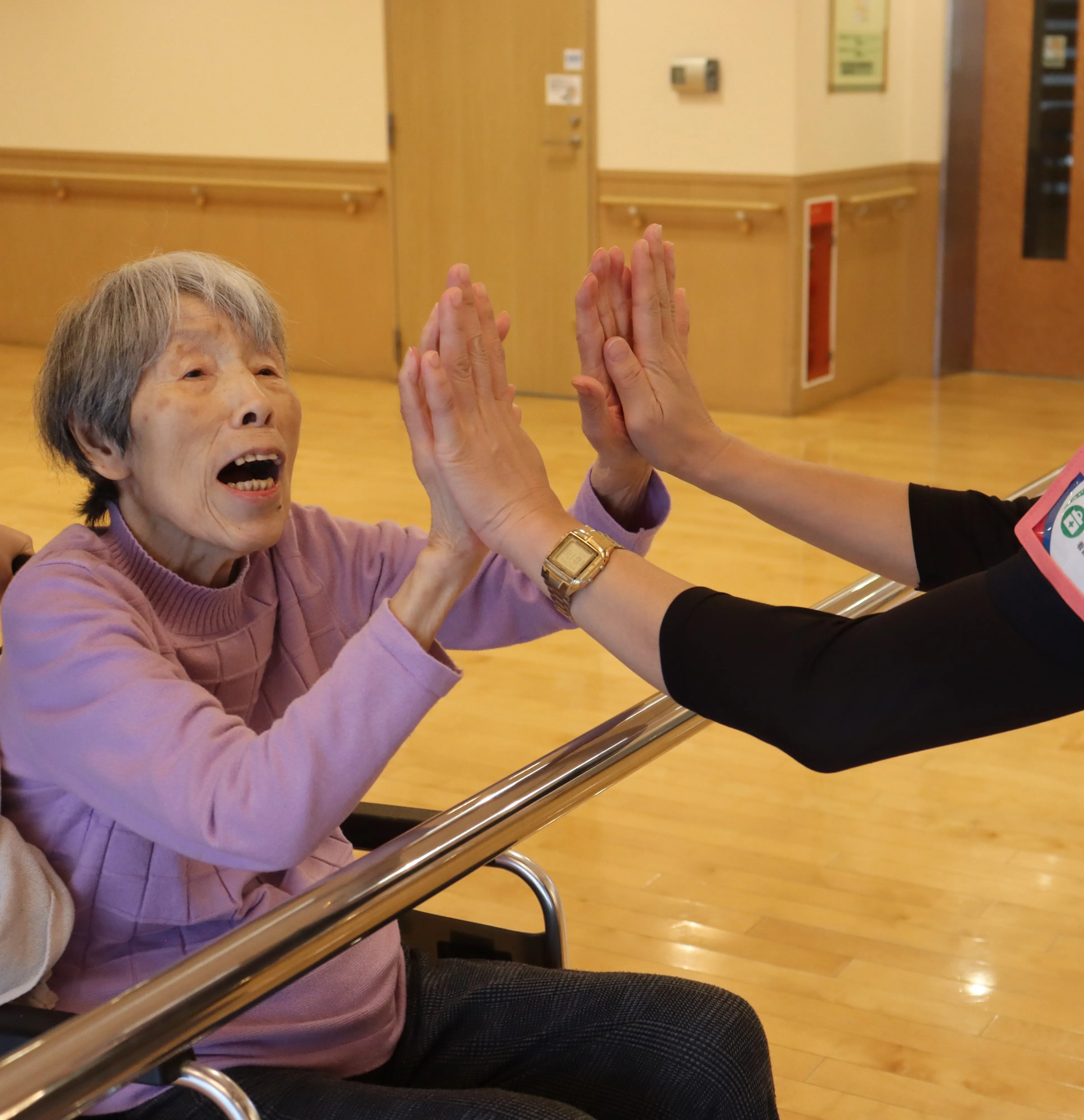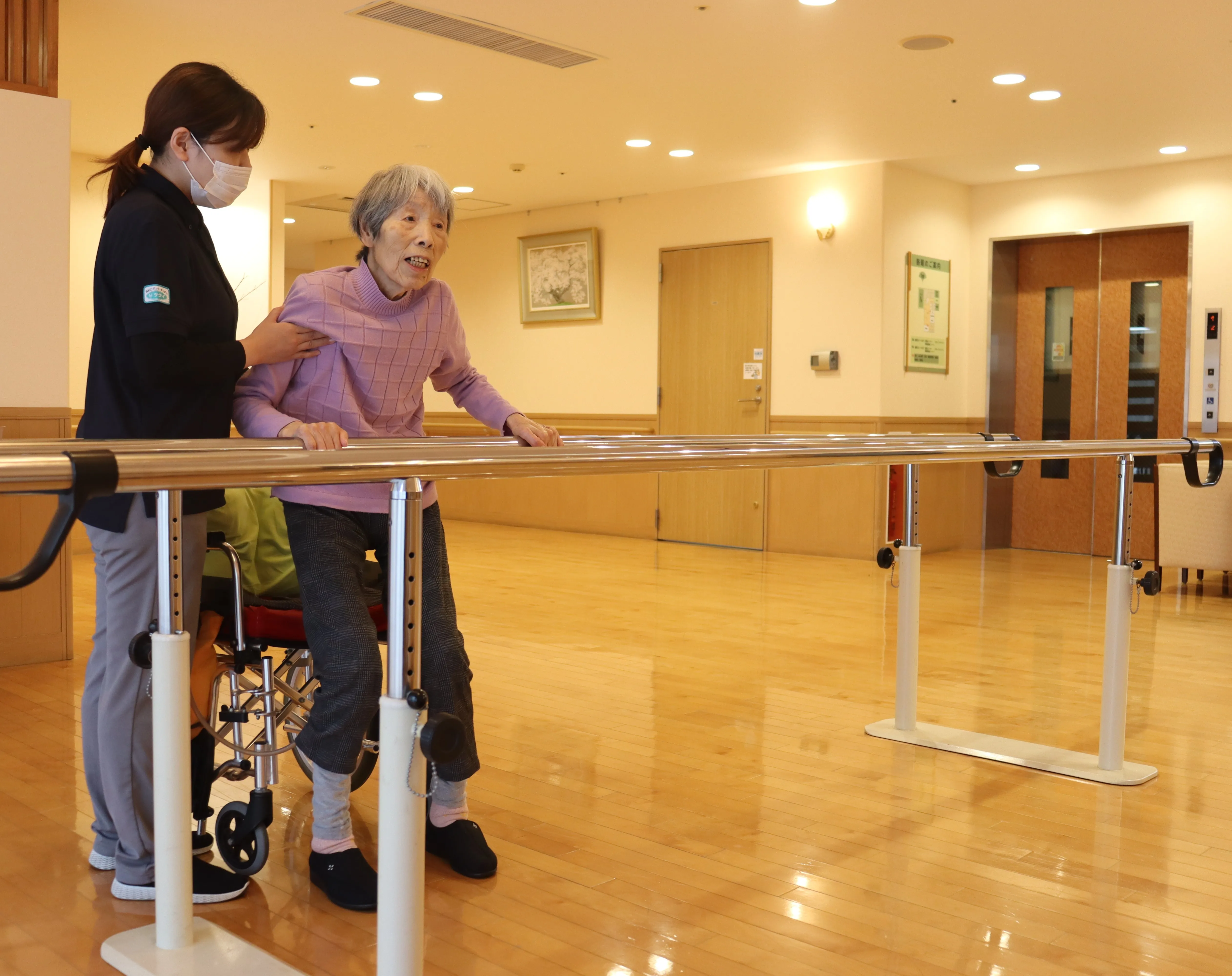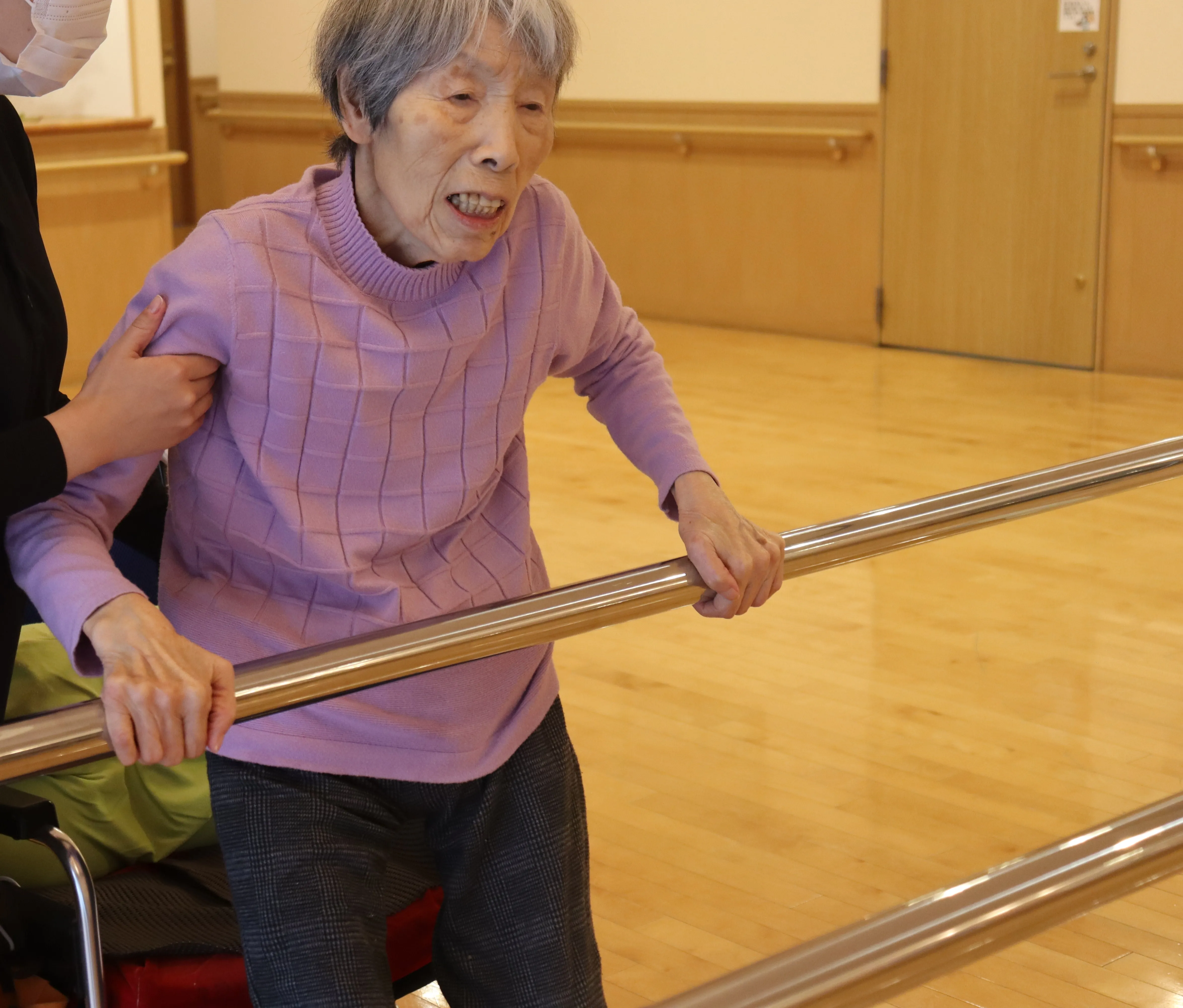 身体機能の維持向上を目的に、平行棒使用して立ち上がりや立位訓練、数を数えてもらいながらの立位保持など行いました。