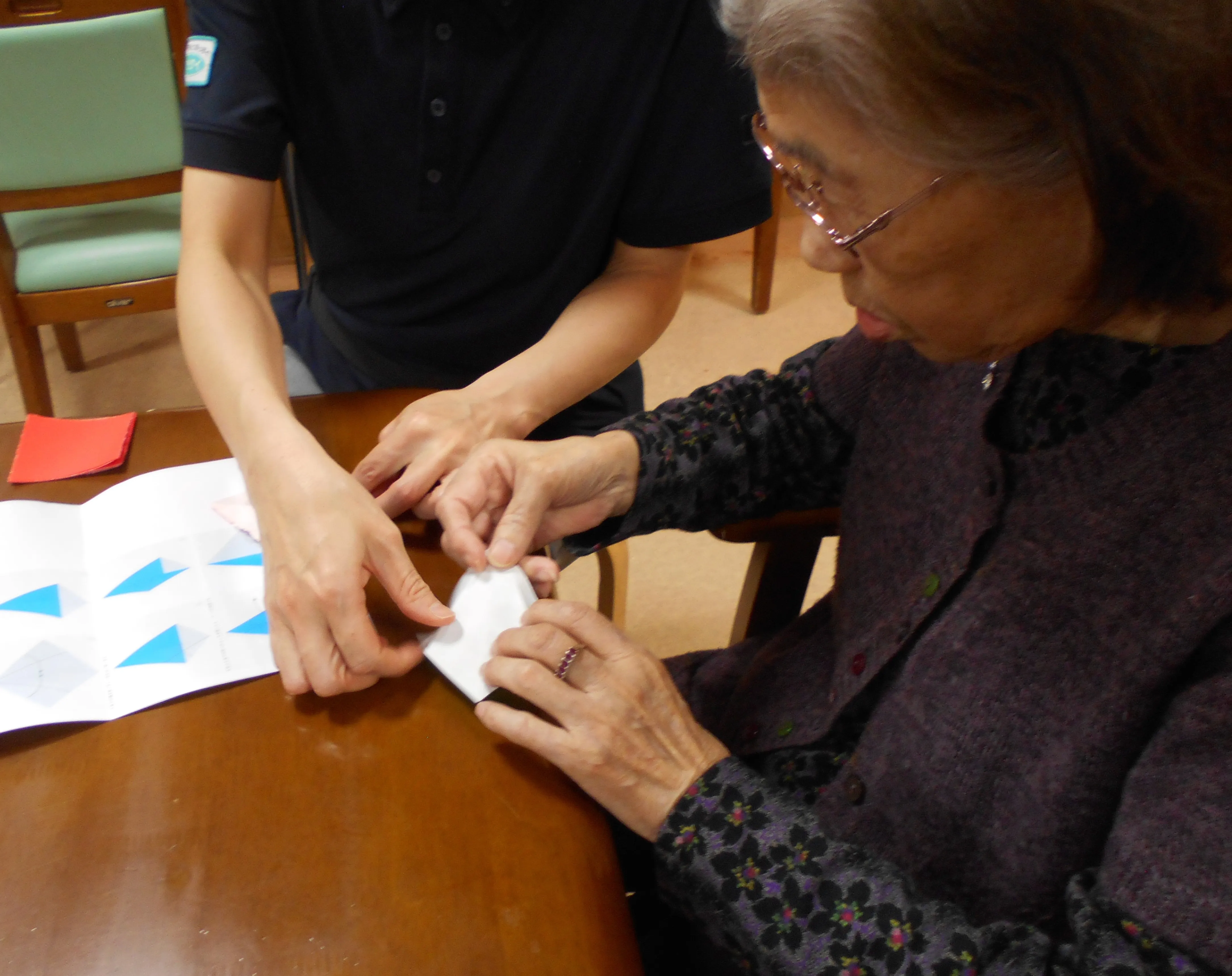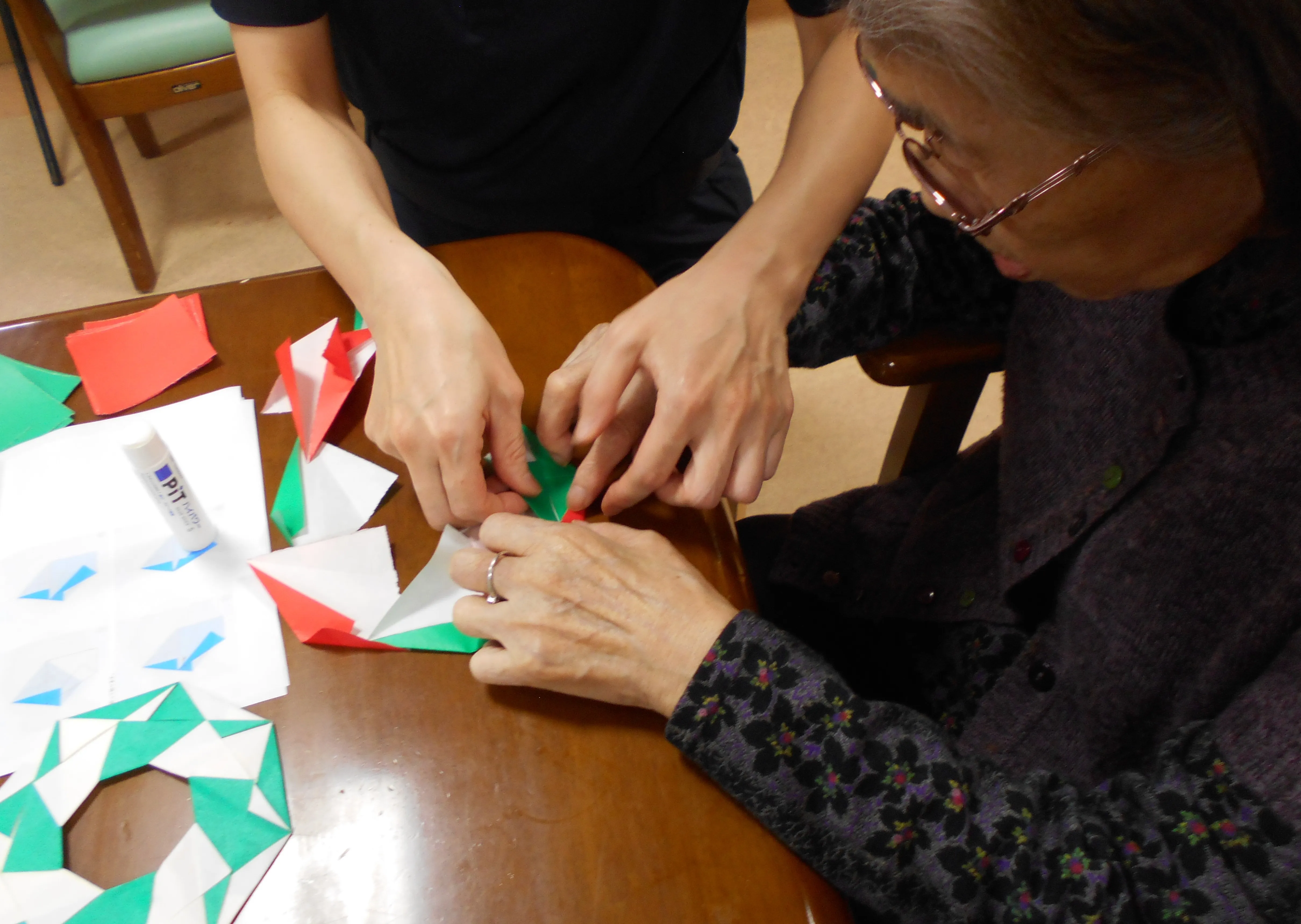 今回は、クリスマスツリーの飾りにもできるようなリースを折り紙で作っていただいています。