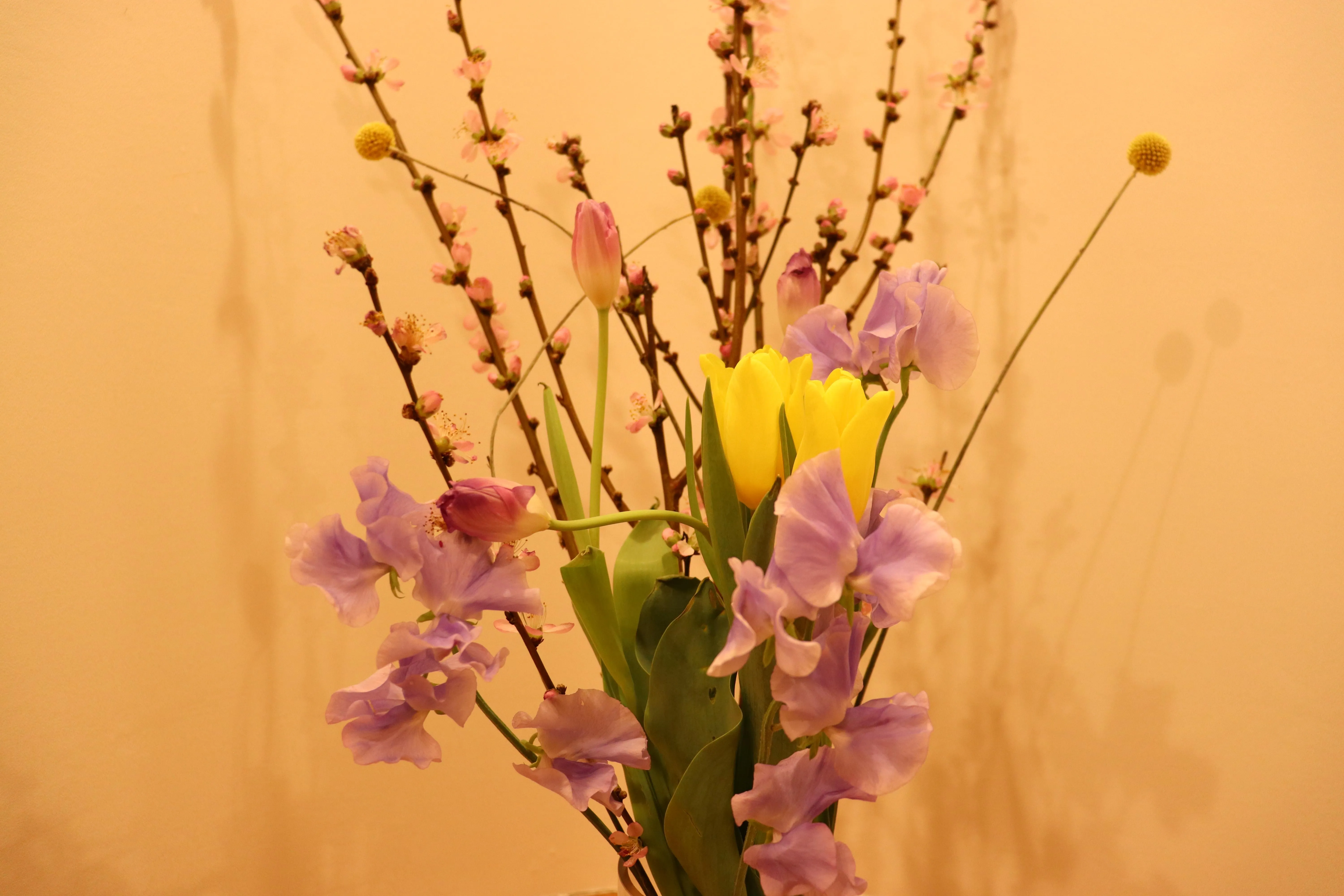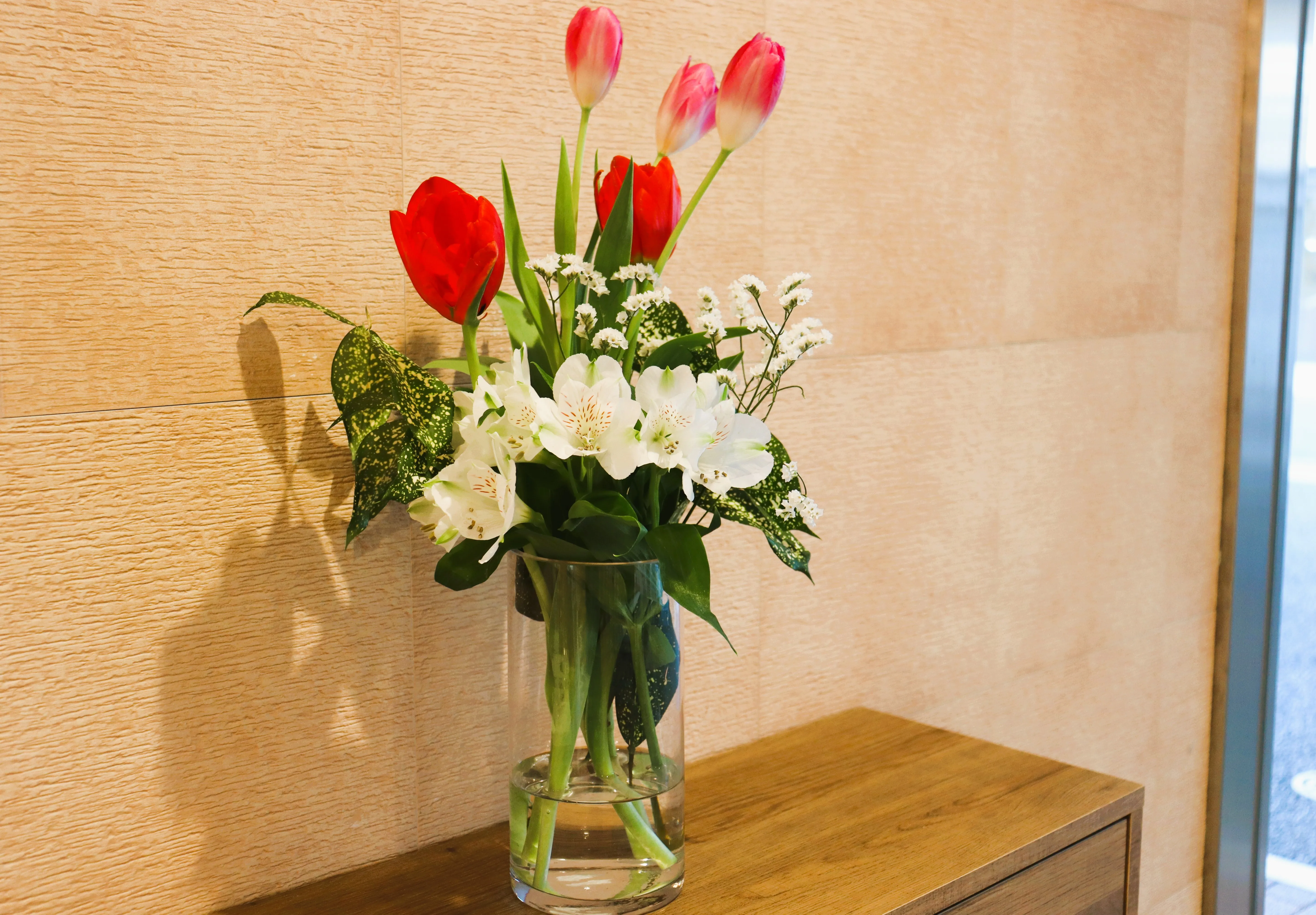 館内に季節のお花を飾っております。桃の花をはじめ、チューリップや淡い色のスイトピーがあり、春の暖かさが思い浮かびます。
