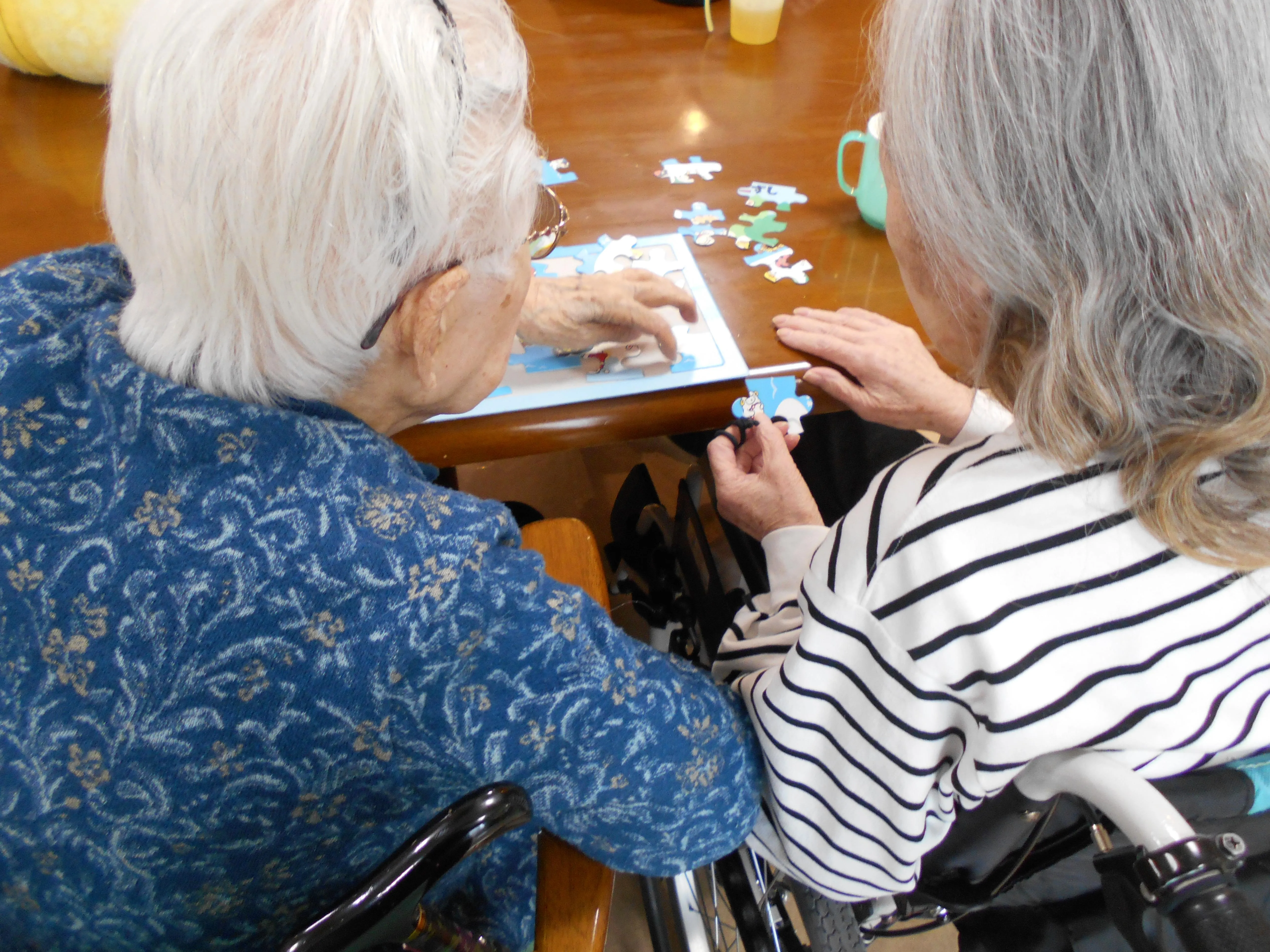 入浴や食事までの時間を利用して、お客様同士でパズルをされていました。考えることで頭を使う体操にもなりますが、「これはどうかな?」「それじゃないよ。」などと、お話ししながら取り組まれていて微笑ましい様子でした。