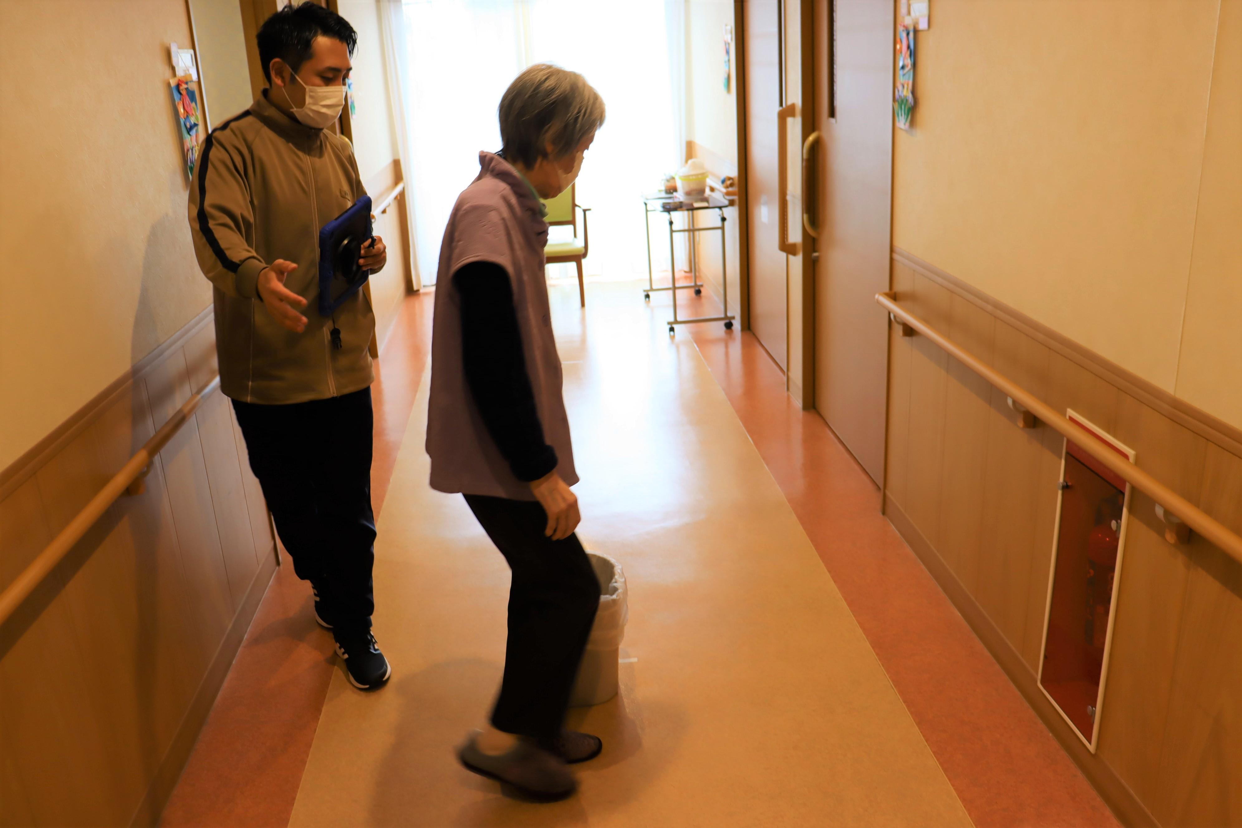 握力や歩行バランス、歩行スピード、立ち上がり回数等の測定をすると、『どれくらい力ある?』『あまり出来なっ方かも』『今の早かったでしょ』『今、何月だったかな?』