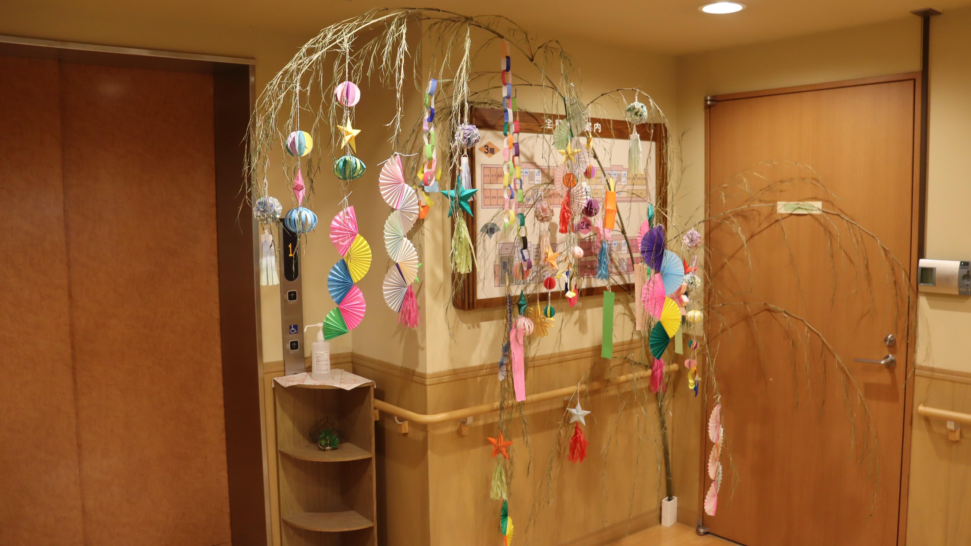 七夕様飾りをしました。短冊に願い事を書いて、飾りつけもしていただきました。玄関と各フロアに飾りつけをしました。皆さんの願いが叶いますように~