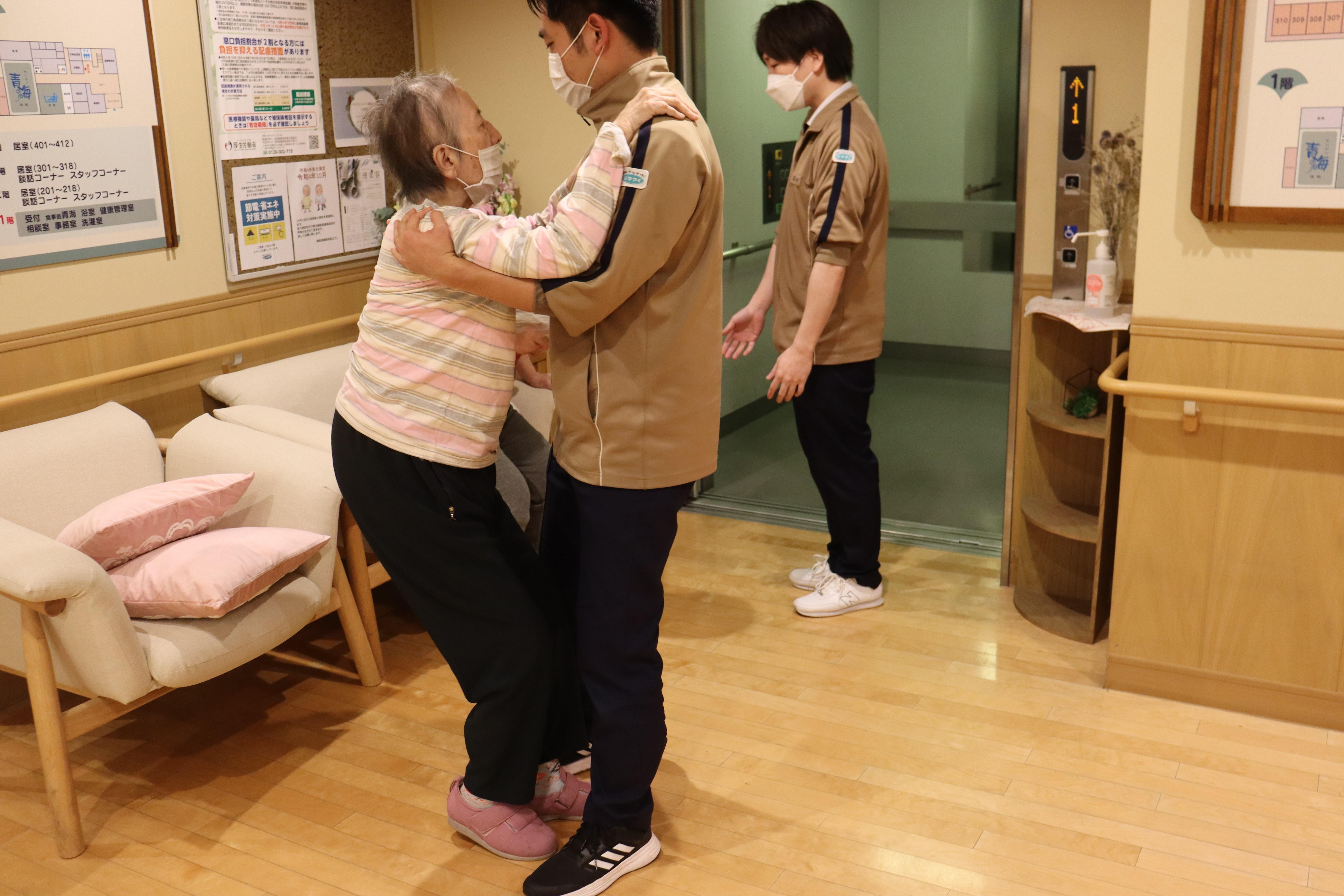 歩行練習をしましょう。前方から抱えますので安心してください。『1、2』『1、2』リズムに合わせてゆっくりと。