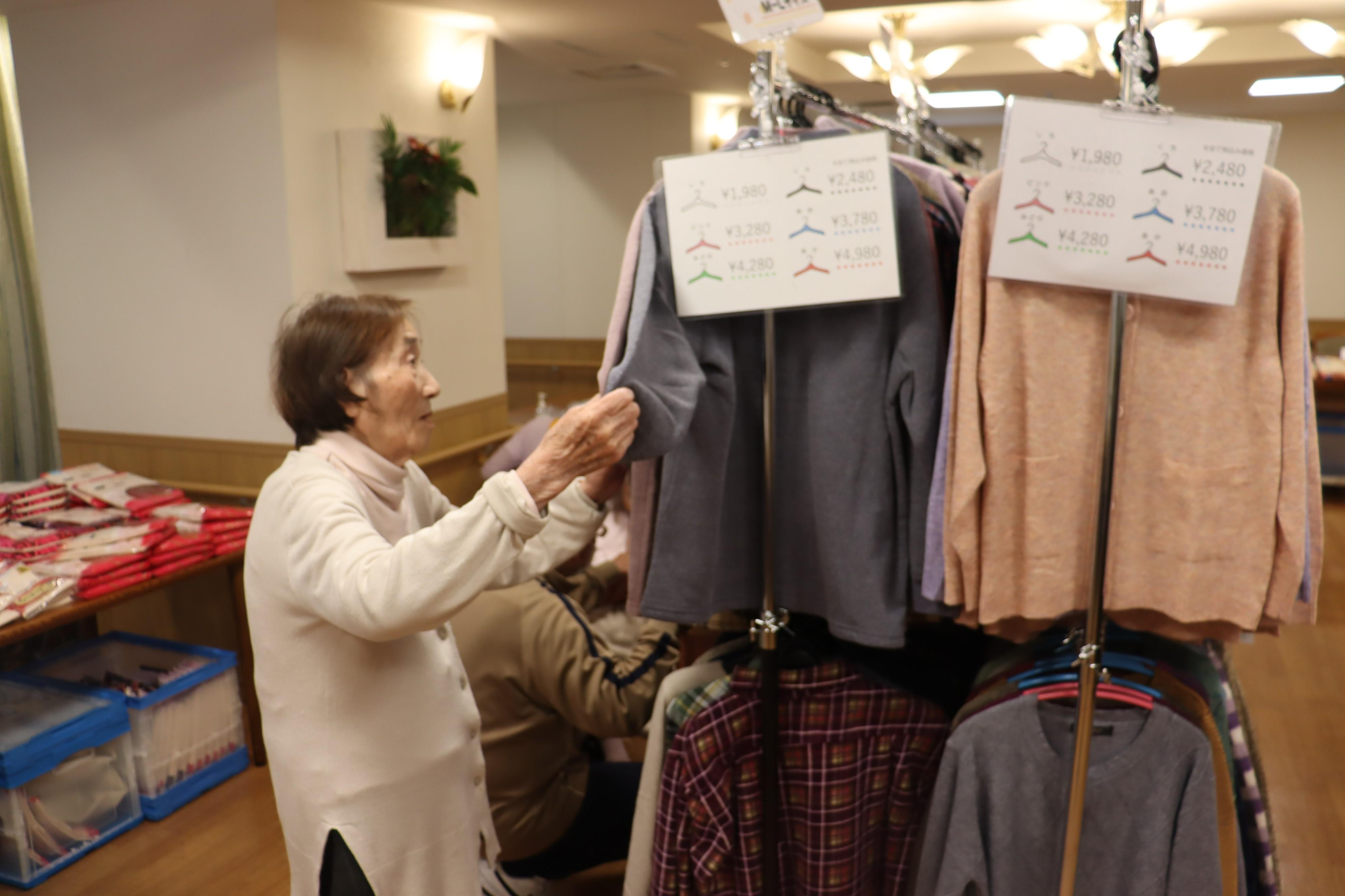 お買い物レクリエーションを開催しました。洋服(シャツ、セーター、ズボン、等)肌着、靴下、食品等々。『何がいいかしら?』『この色も素敵ね!』『このお菓子、美味しそう』皆さん、買い物を楽しんでいただきました。
