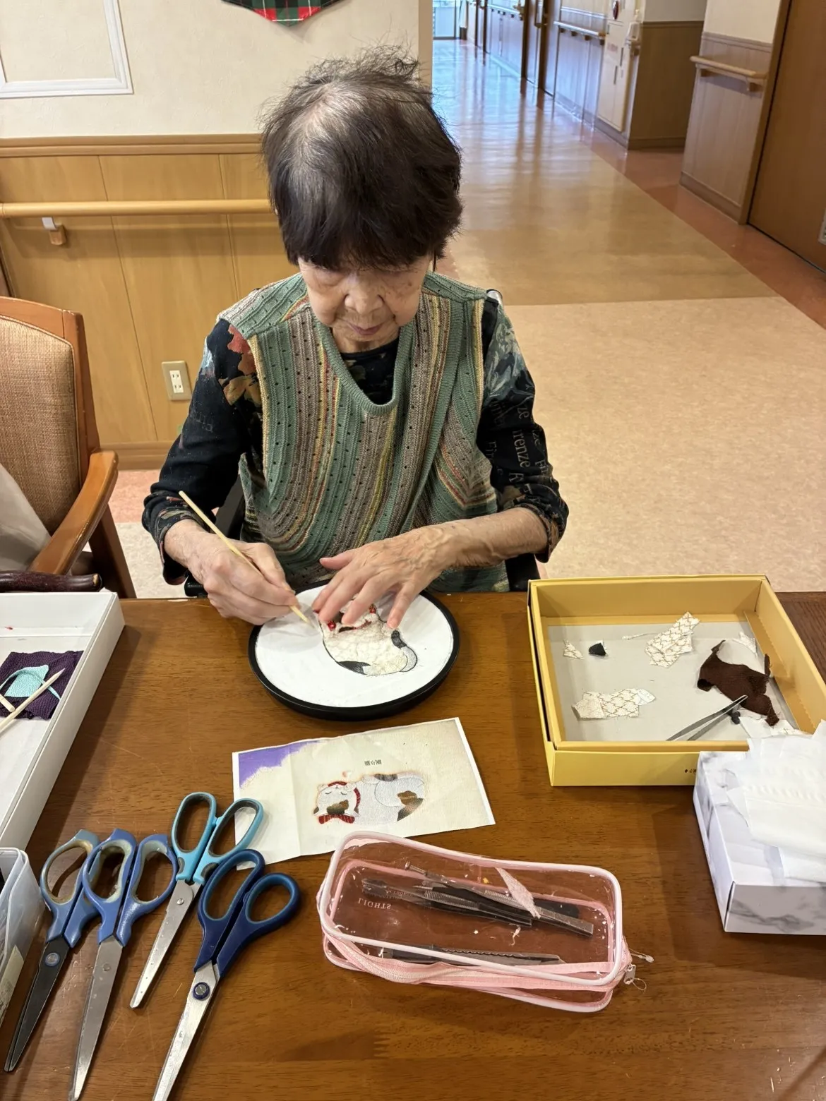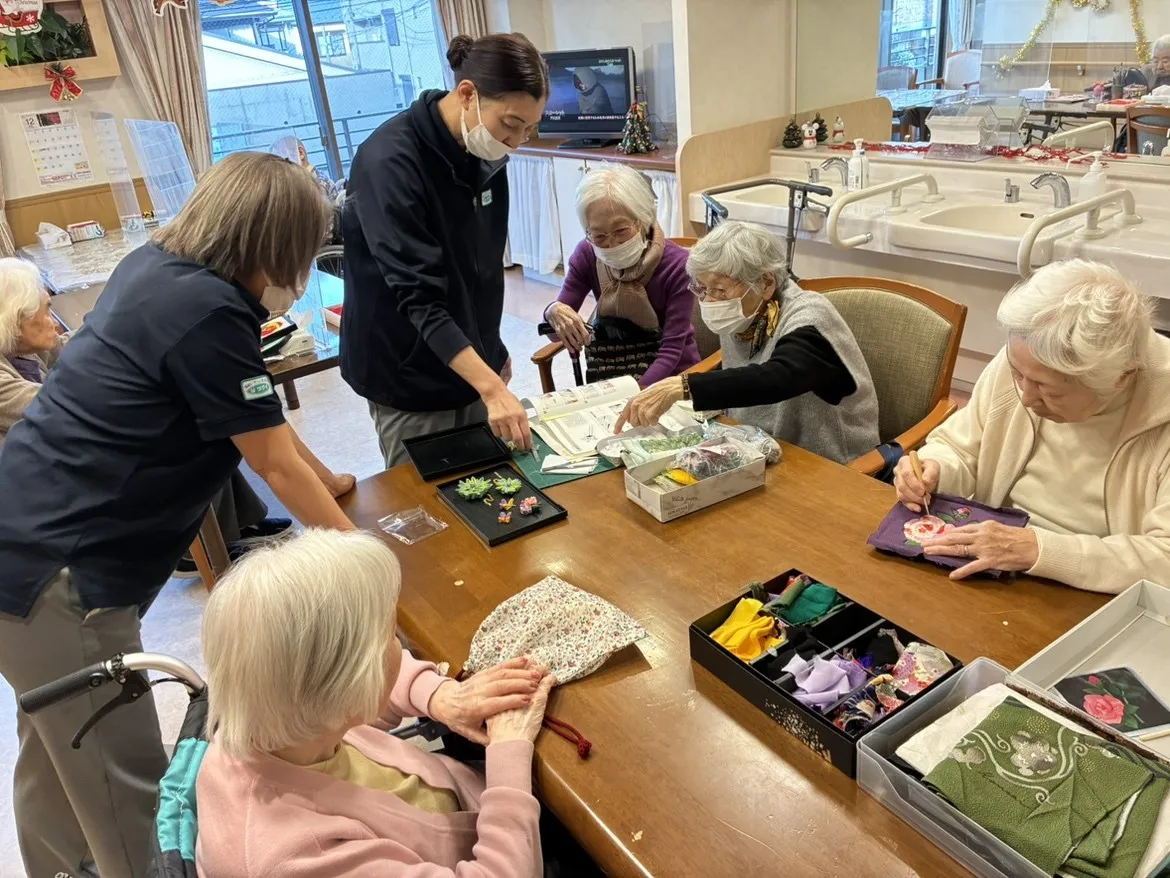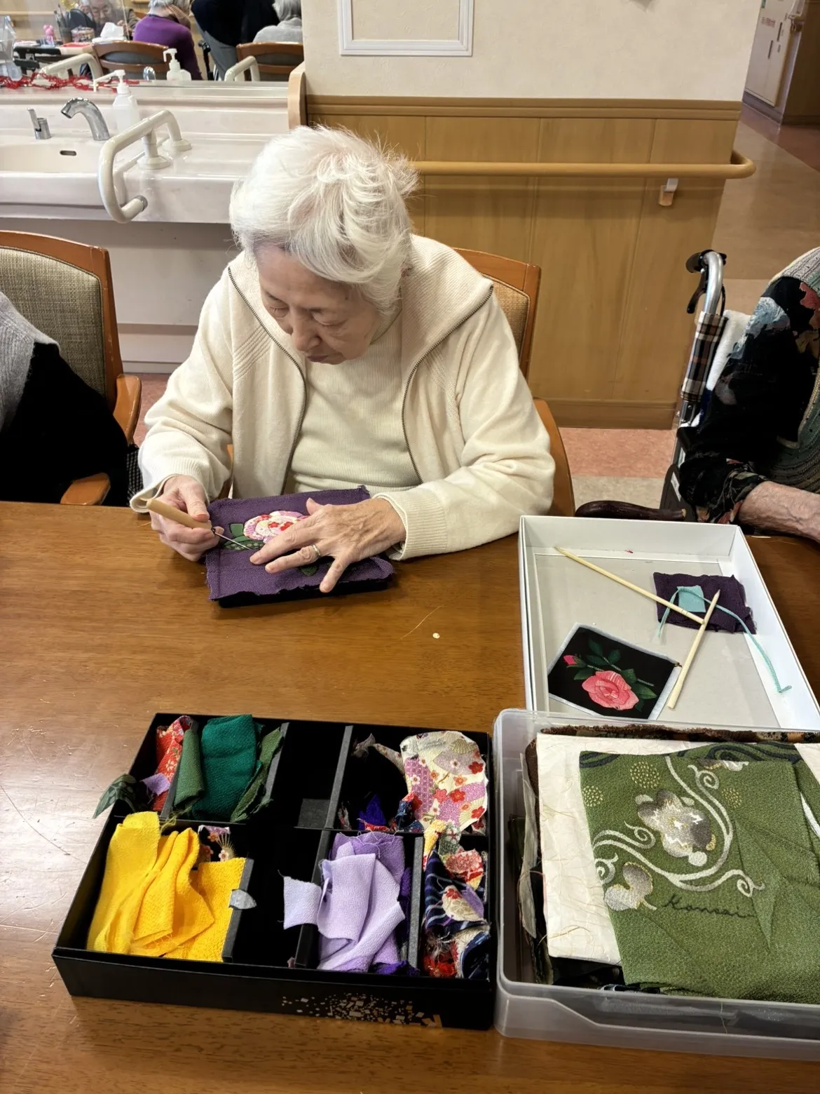 手作業による機能訓練として、以前から【木目込み】をしていましたが、【つまみ細工】も作成しています。「何を作るか?」「菓子盆上のデザインはどうするか?」等、いろいろ考える事も楽しみながらの訓練になって、次々とアイデアが生まれているようです。