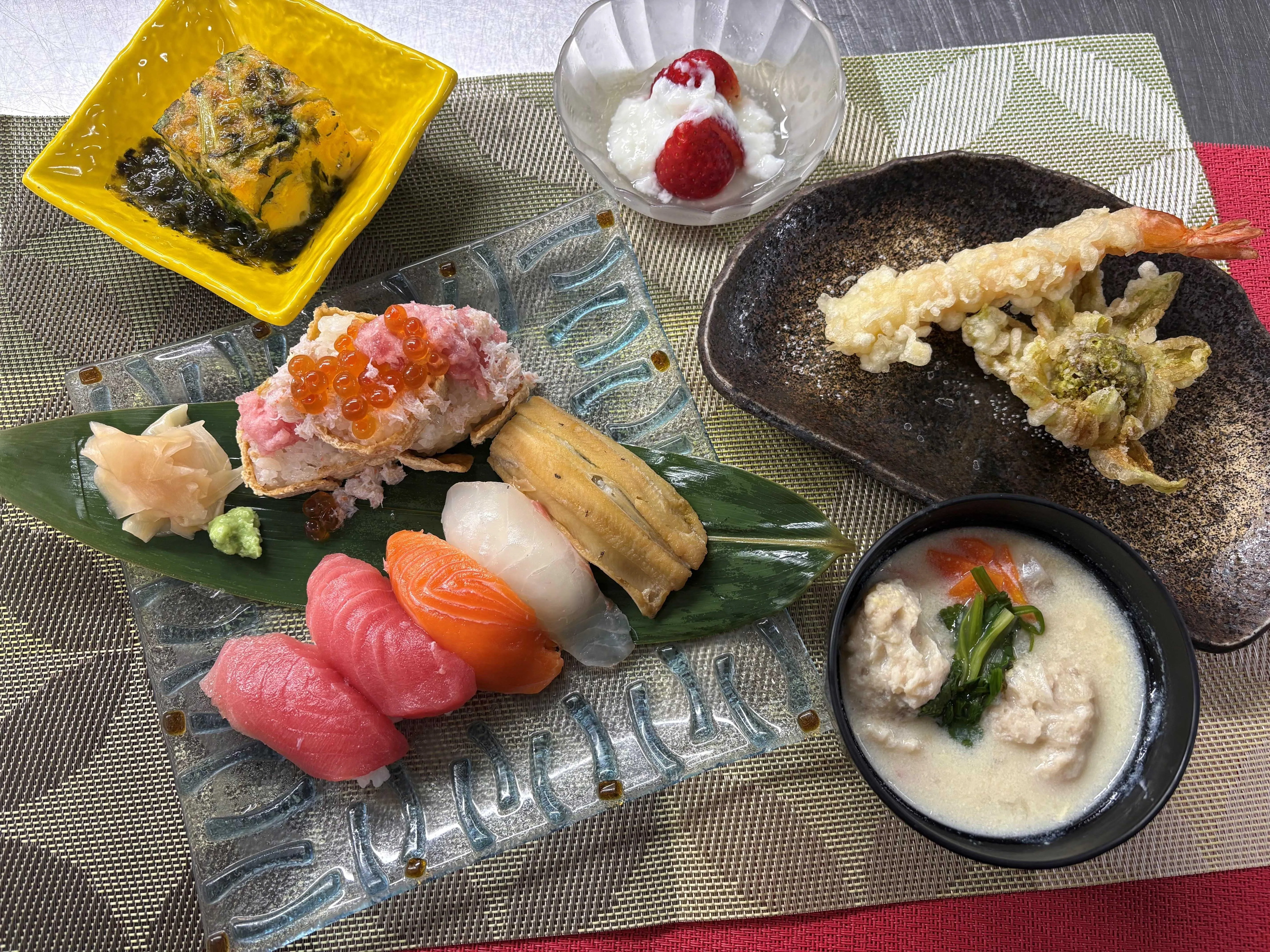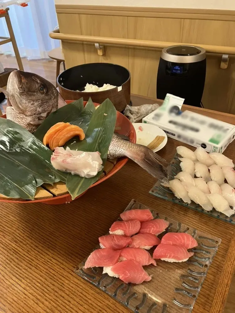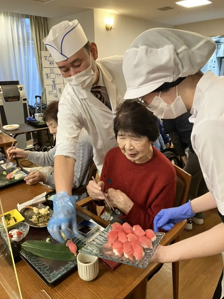 握り寿司イベント開催。寿司職人の方が来て、握って頂きました。【マグロ、サーモン、アナゴ、鯛】おかわりも自由で「とても美味しいから、どんどん食べれちゃう」「本当に美味しい!こんなに美味しいマグロはこの辺じゃ食べられないわよ」と、とても満足していただきました。
