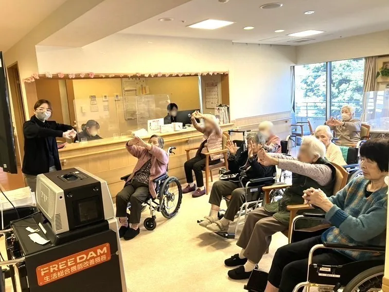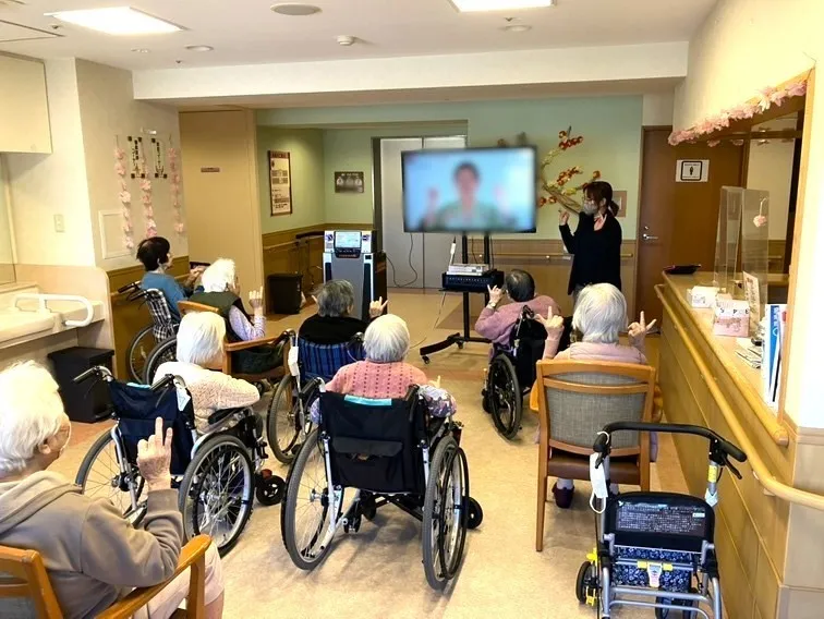 集団体操【機能訓練指導員開催】週5回開催 10:00~11:00体操をした後に、脳トレ問題(クイズ、指体操)等をみんなと楽しく実施しています。