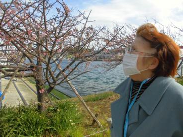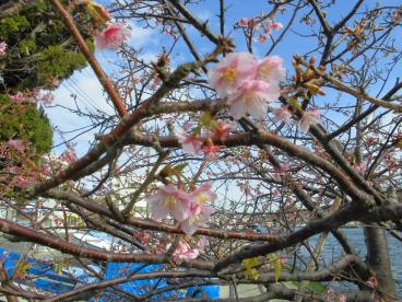 暖かい日が続き、施設の近くに咲く河津桜の花が開いてきました。