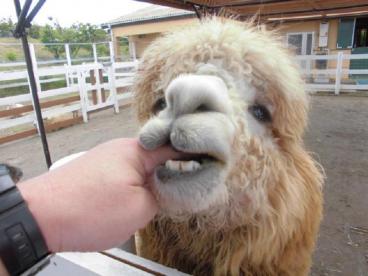 本物のアルパカに指をかじられているのは、職員です。