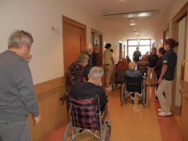 今回の出火場所は、1Fの厨房ということで、普段みなさまがご利用される”談話室”から一番遠い、道路に面した側の通路へ避難していただきました。
