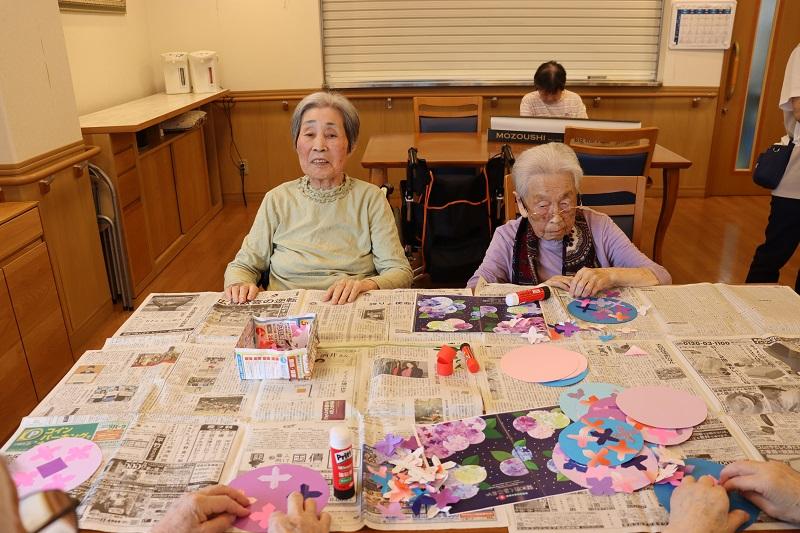 紫陽花の壁画作成を行いました。大きい模造紙に、できた紫陽花を張り付けて頂きましたが、どのように張るといいか、構図に悩まれるご様子もみられました。まだお花が足りず未完成ですが、素敵な壁画になりそうです!